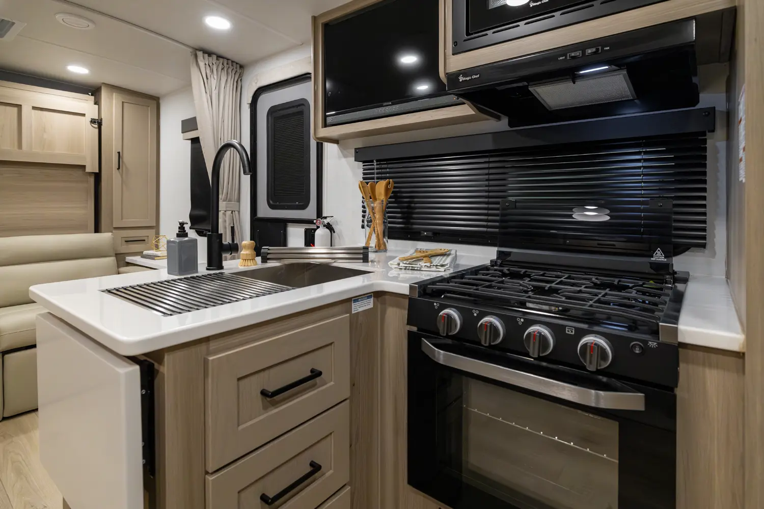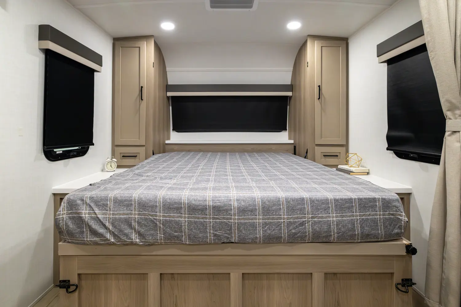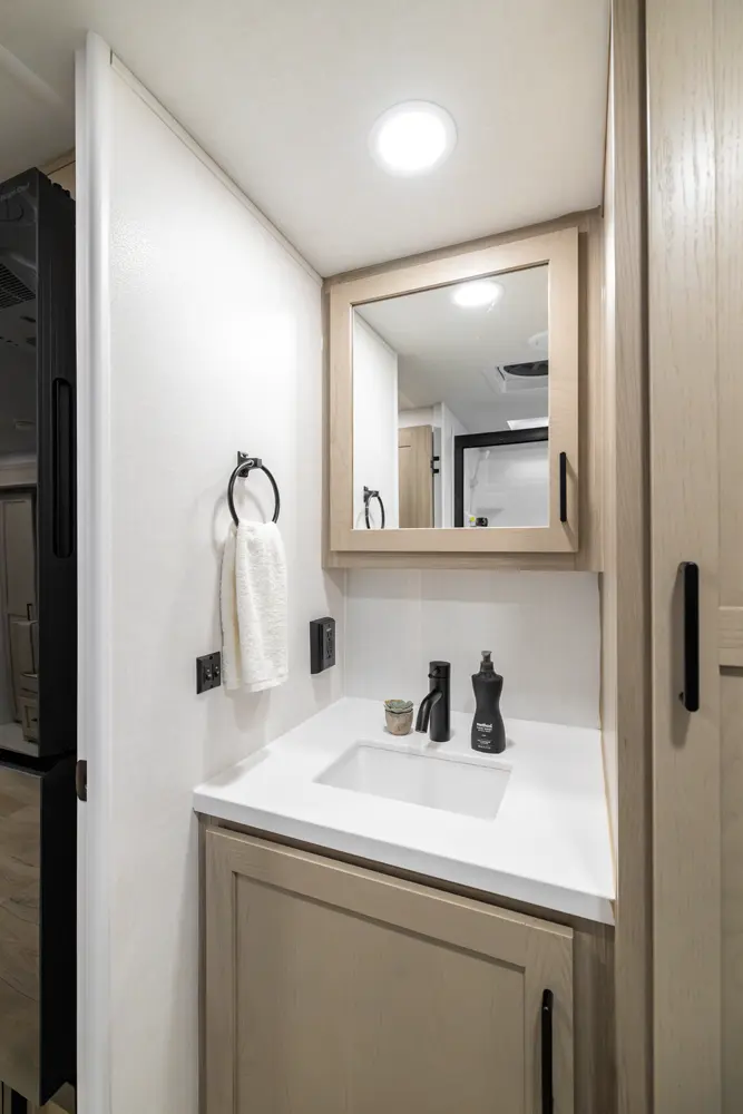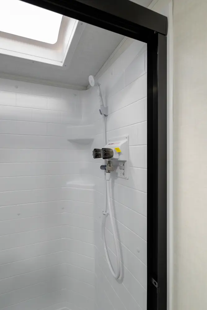 The 22SQS delivers a smart, comfortable layout with a front Murphy bed that maximizes living space by day and provides a restful sleep at night. The U-shaped dinette offers plenty of room for meals, games, or extra sleeping space when needed. A large rear bathroom with a rectangular shower adds everyday comfort and convenience making this floor plan a great choice for couples or small families who want big features in a compact trailer.