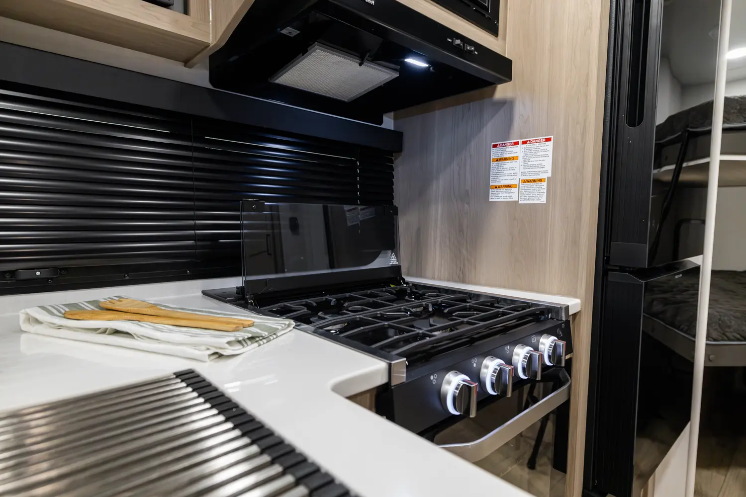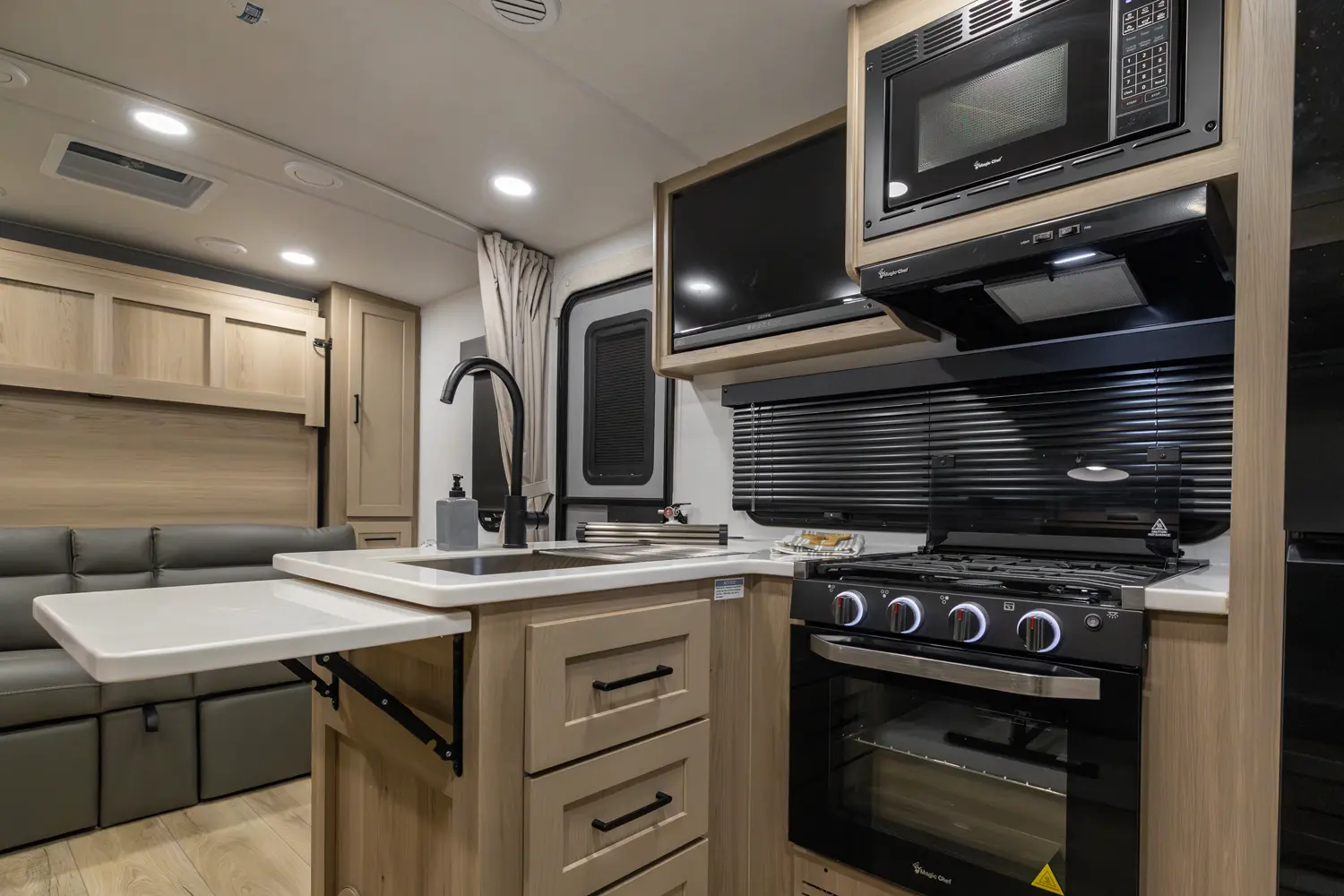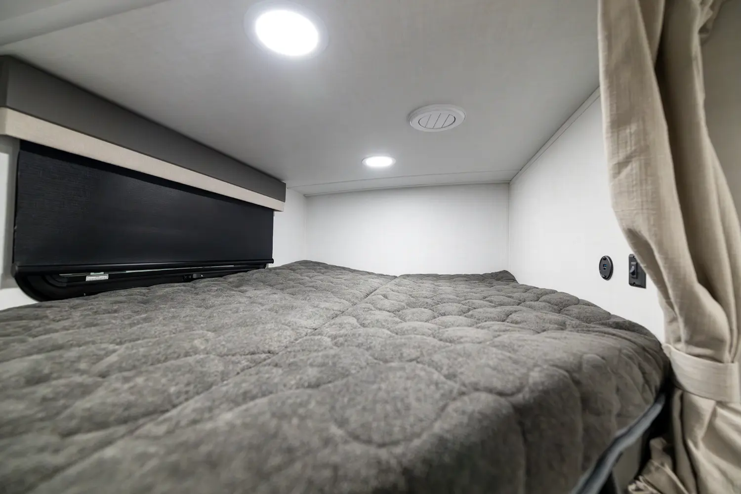 This is the perfect family trailer towing under 26' feet. The double 48" X 72" bunkhouse is awesome for sleeping the kids and even fits adults comfortably. The bottom bunk folds up for even more storage and toys will fit nicely underneath! The big 60" X 74" murphy bed folds up into a sofa for daily use. The giant 18' awning goes almost all the way across your unit while covering the outside kitchen.