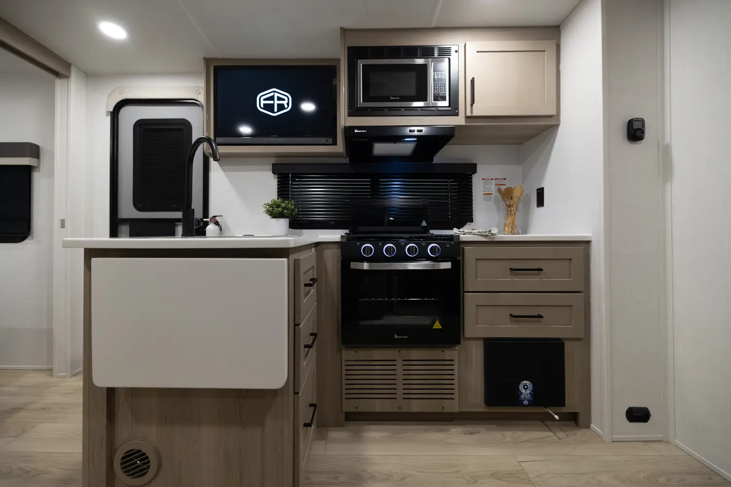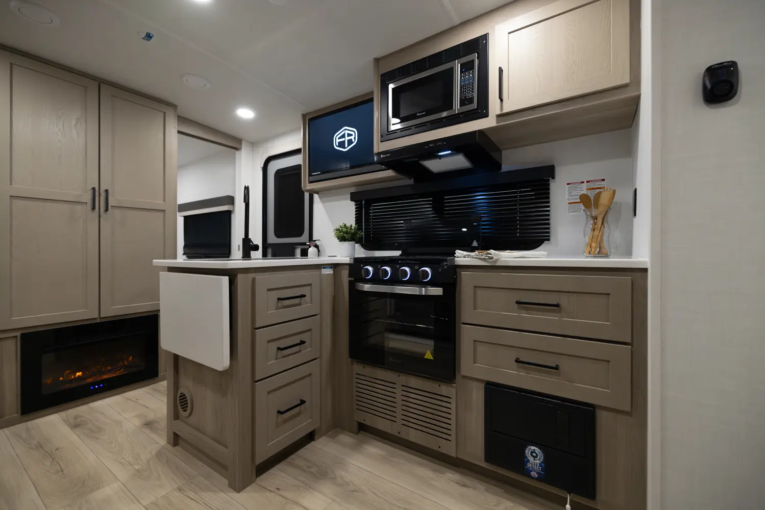 The outside kitchen on this Flagstaff Micro Lite featuring our new griddle, a refrigerator and grill makes cooking so enjoyable and flexible. No need to take the smell of cooking bacon inside. The large wardrobe slide makes packing and organization so easy. The large pantry next to the bathroom covers all your kitchen storage needs as well. The center position of the television in your entertainment spaces makes viewing from any part of the living quarters easy.