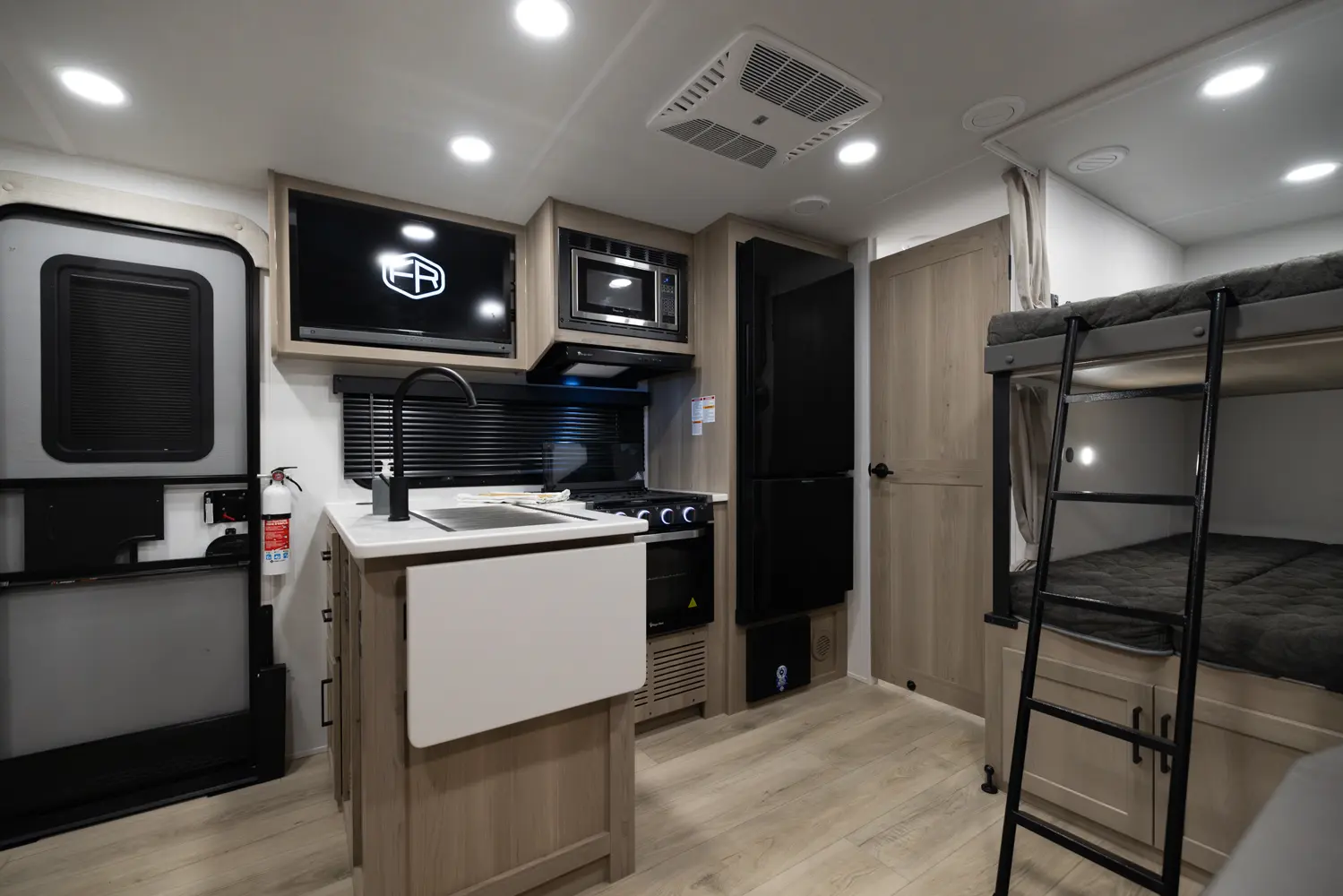 The 25DBH is a bunkhouse layout featuring a segregated front bedroom with a true queen bed and dual wardrobe closets for plenty of personal storage. In the main living area, you'll find a large U-shaped dinette, a spacious kitchen and two 36" x 71" bunks- perfect for kids or guests. This layout blends privacy, comfort, and roominess. An ideal setup for families and groups seeking versatile space on the road.