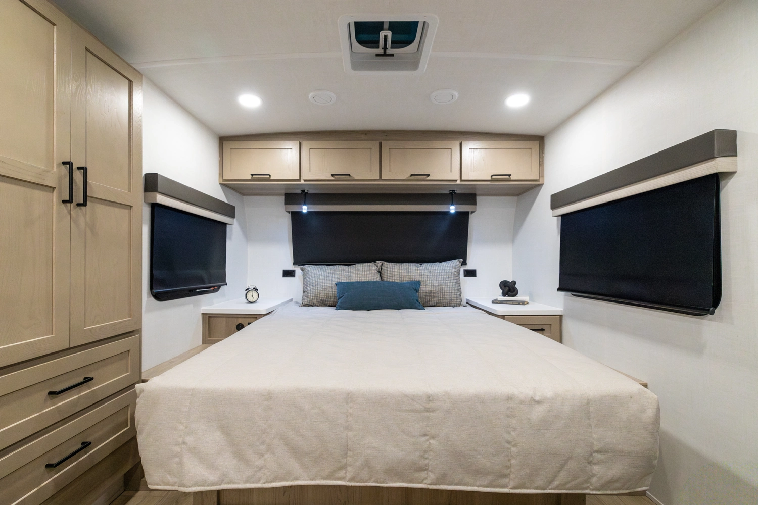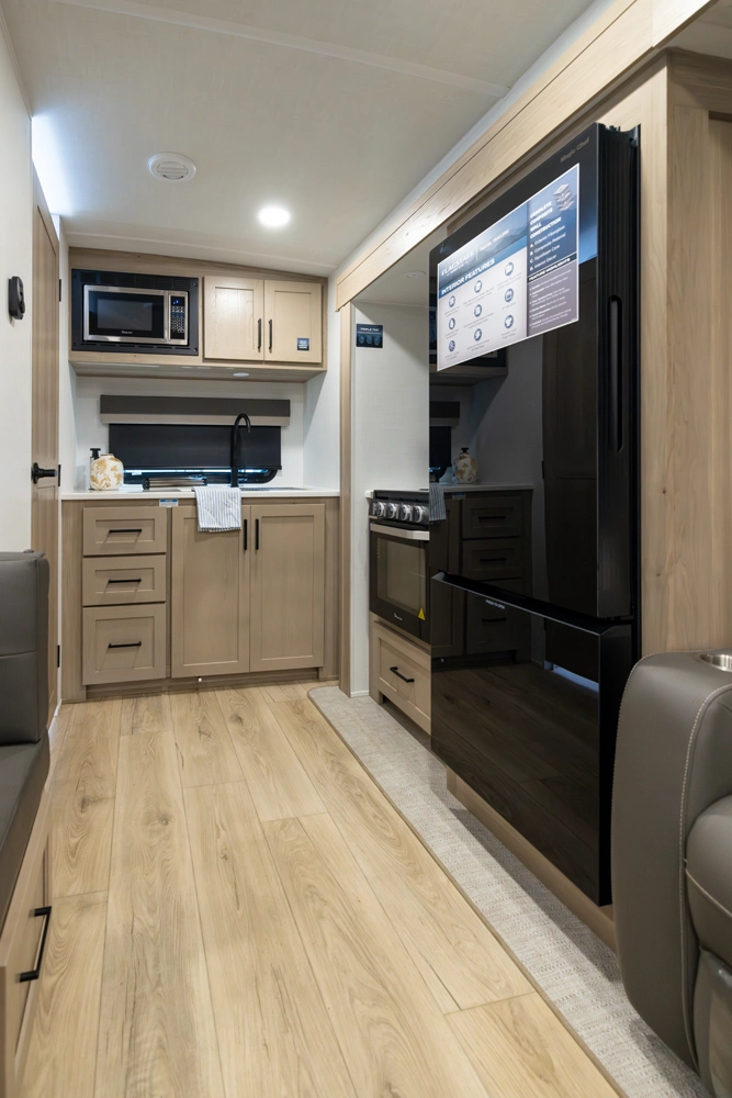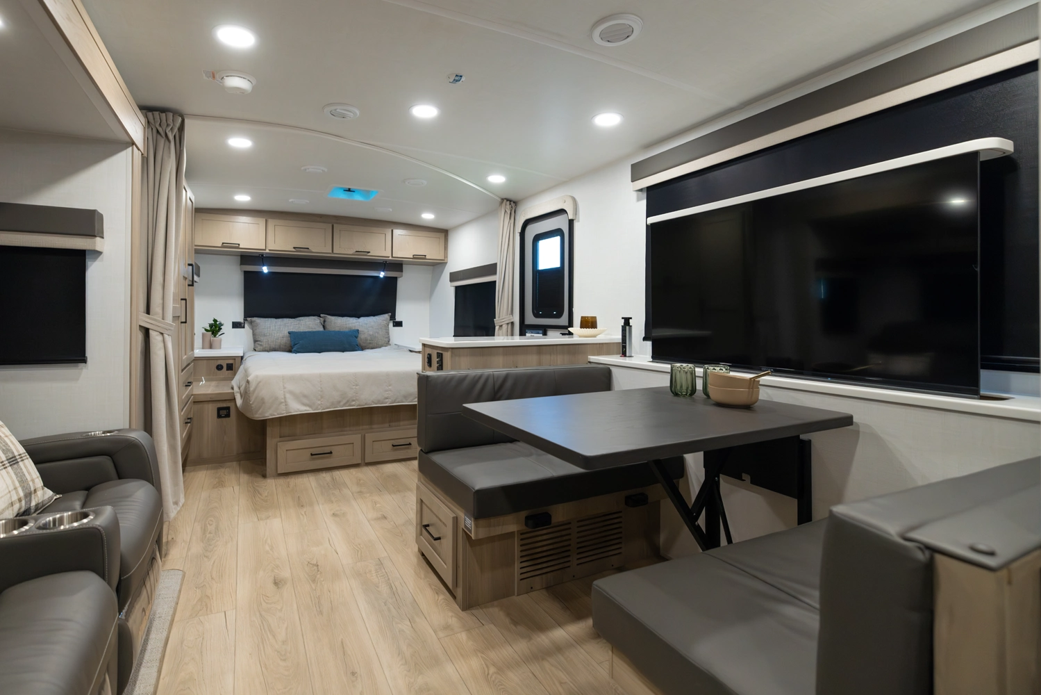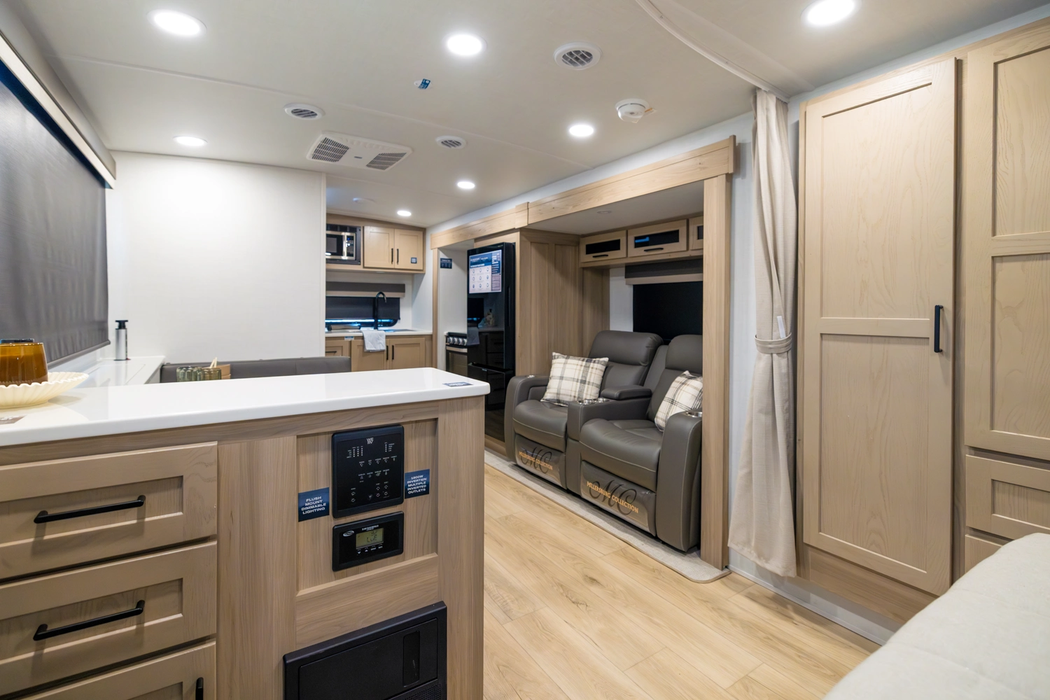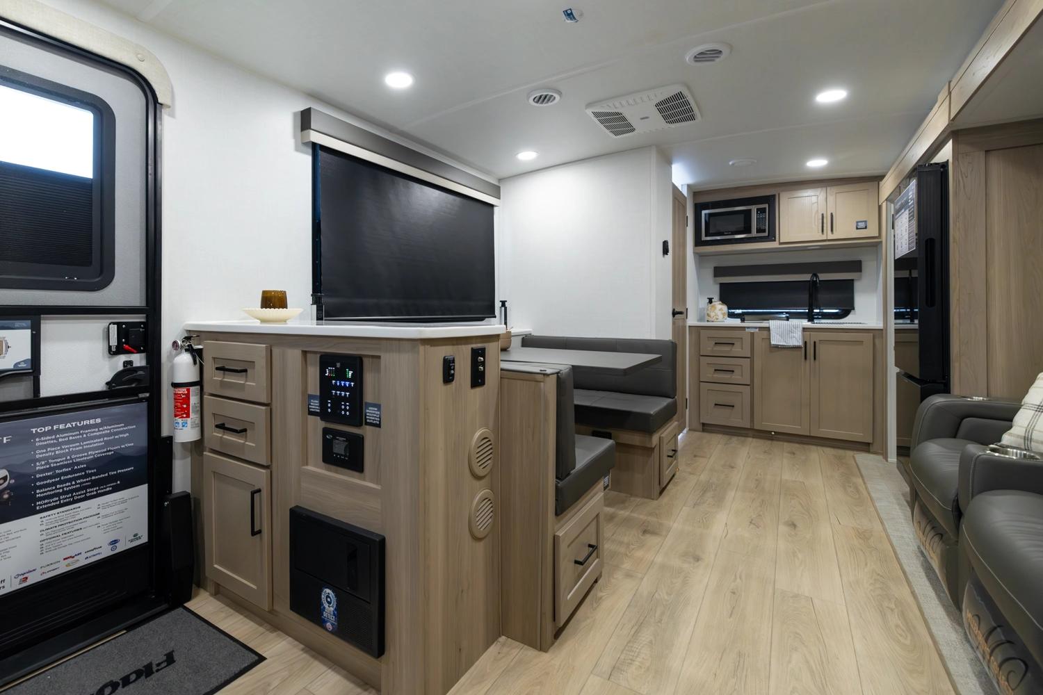 The 25FBD is a beautiful front bedroom floor plan featuring a unique wardrobe/pantry slideout for exceptional storage and organization. The living area includes theater seating directly across from the adjustable “televator” which raises for TV viewing and lowers so you can enjoy the massive door side window views. A versatile dinette and spacious rear kitchen with plenty of counter space completes the thoughtful design.