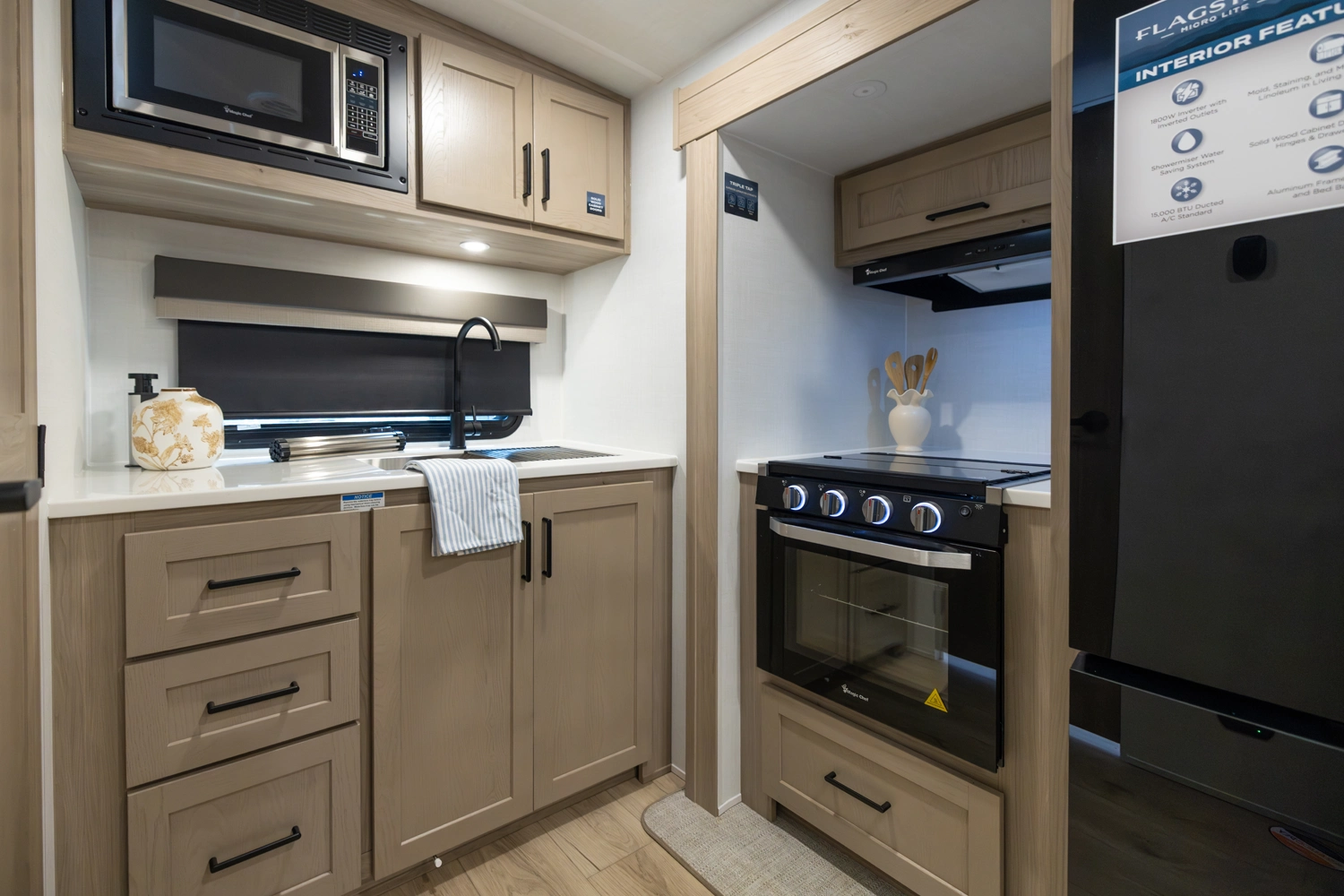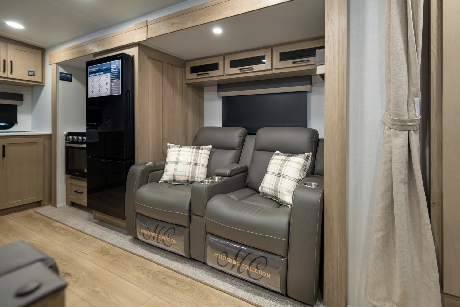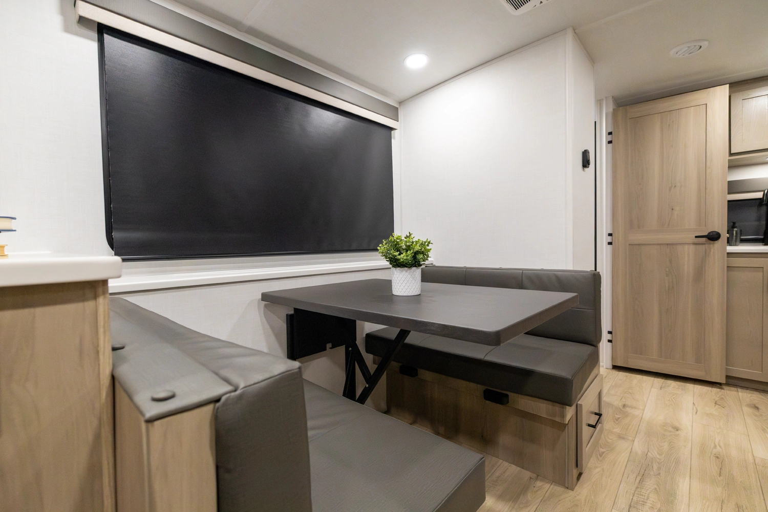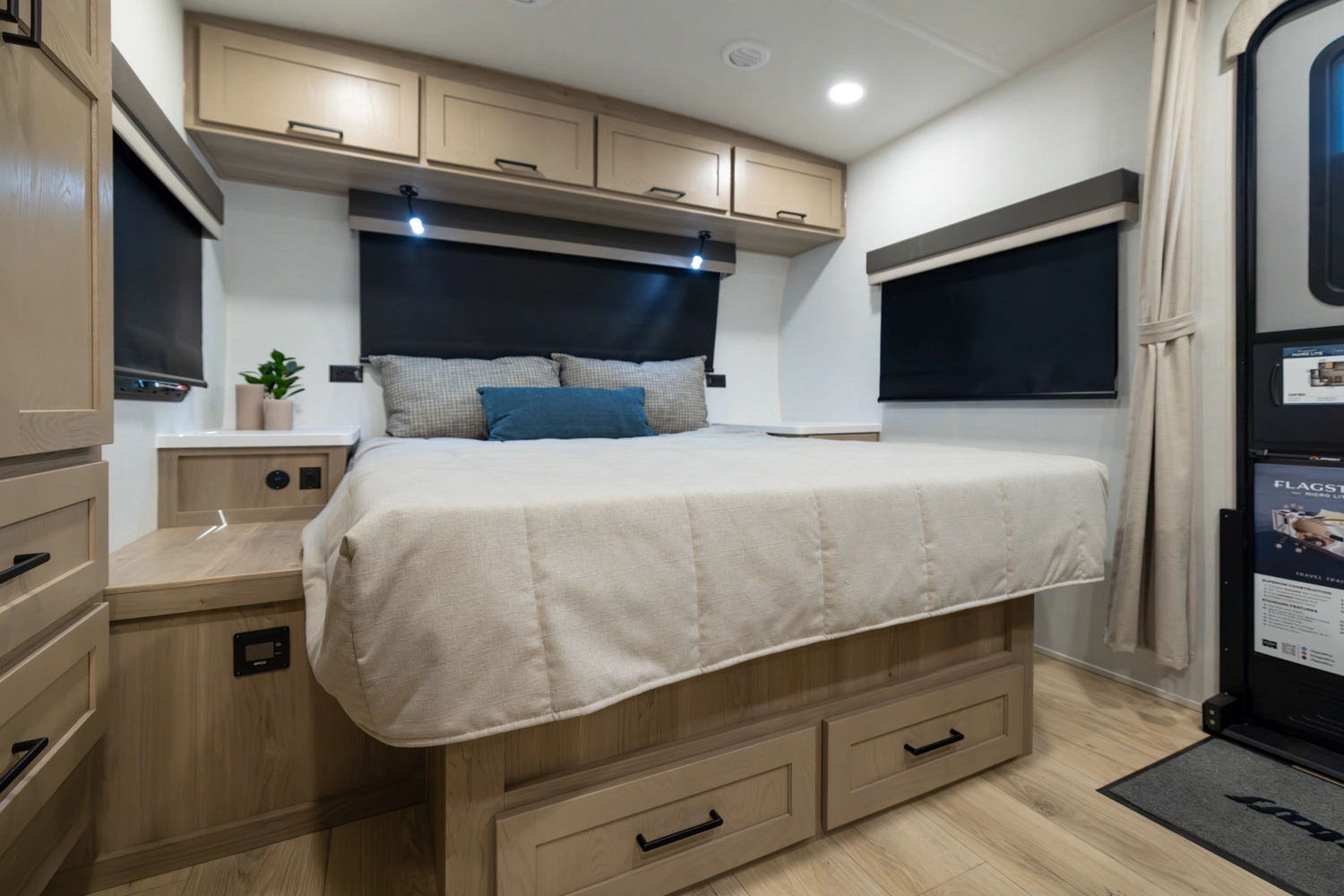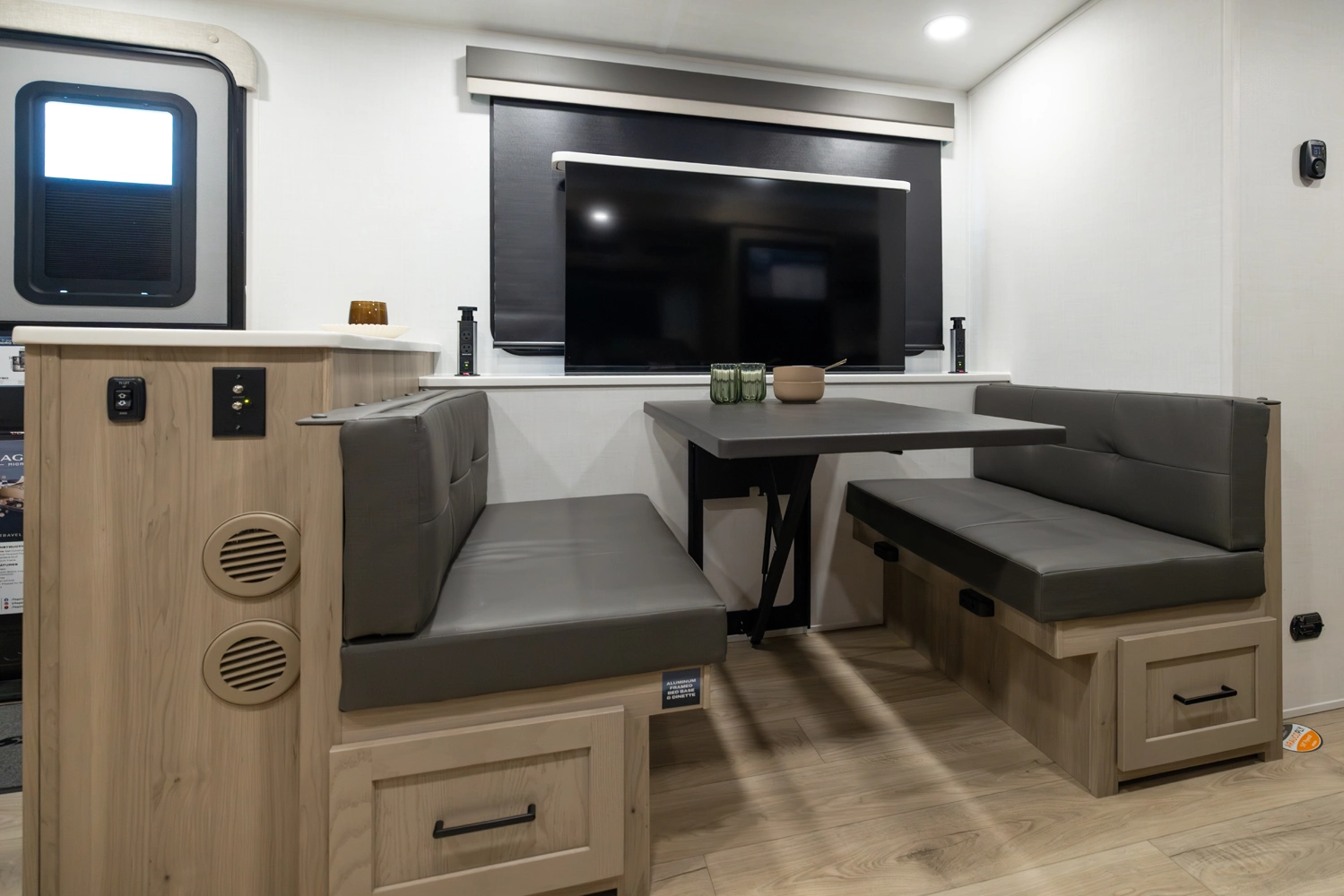 The 25FBD is a beautiful front bedroom floor plan featuring a unique wardrobe/pantry slideout for exceptional storage and organization. The living area includes theater seating directly across from the adjustable “televator” which raises for TV viewing and lowers so you can enjoy the massive door side window views. A versatile dinette and spacious rear kitchen with plenty of counter space completes the thoughtful design.