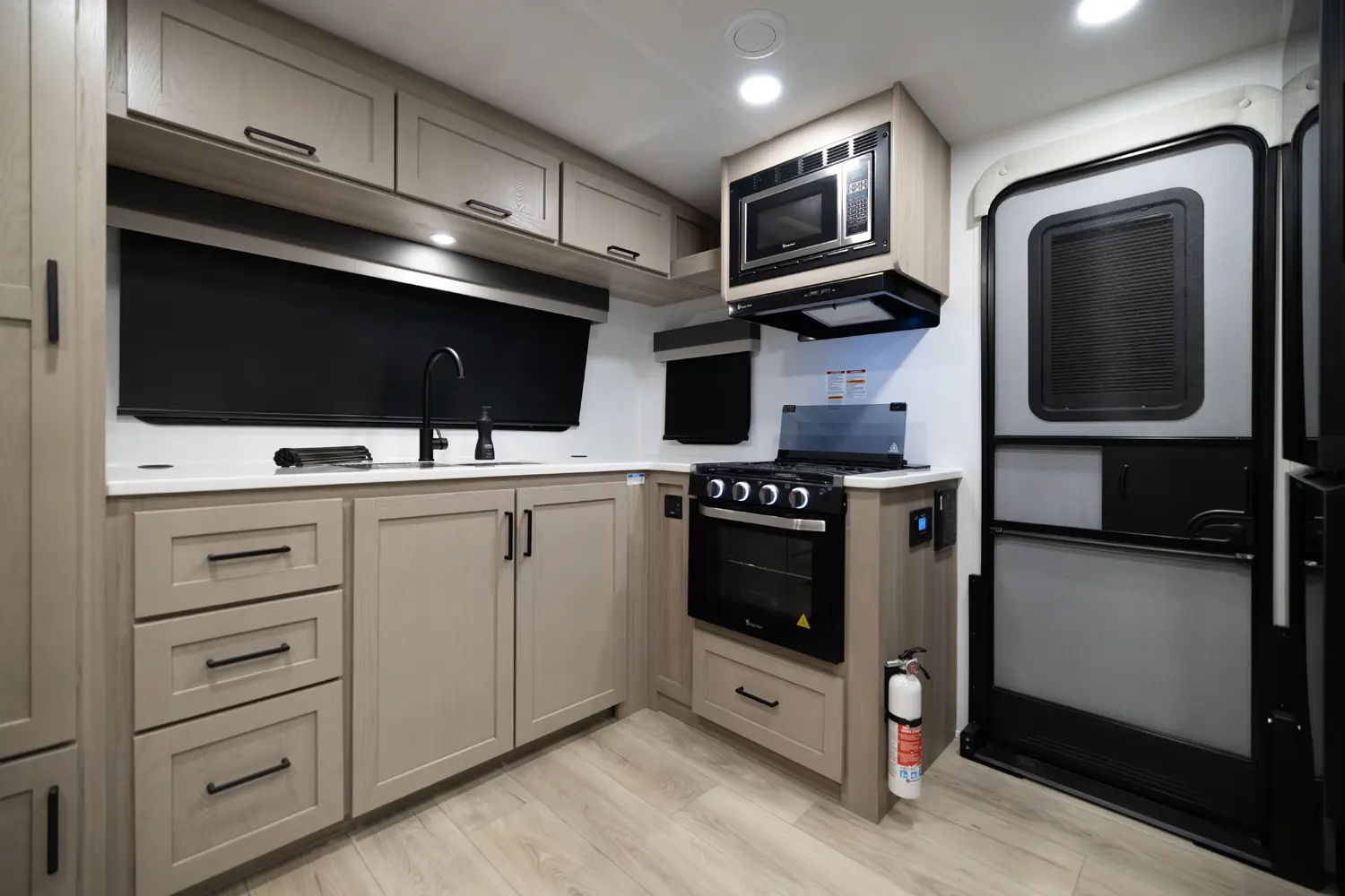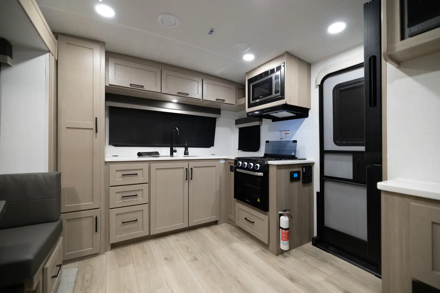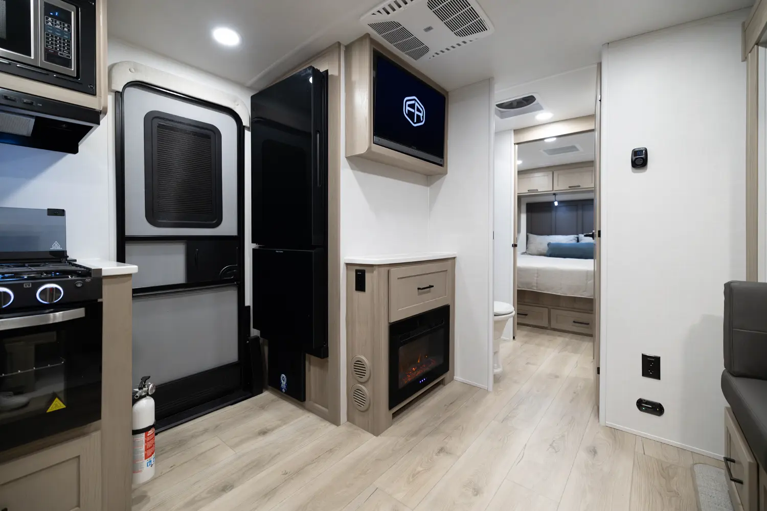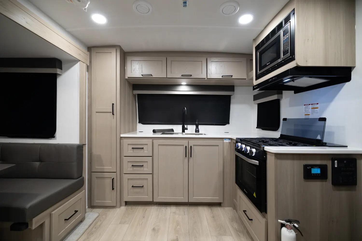 The 25FKB blends spacious comfort with smart design for a great value. The front kitchen offers abundant counter space and storage, perfect for meal prep and entertaining. The U-shaped dinette provides a roomy dining area that can convert to extra sleeping space. (optional Hide-a-Bed or Theater seating) The pass-through bathroom comes equipped with a large rectangular shower, and the rear bedroom gives you a private retreat on the road.