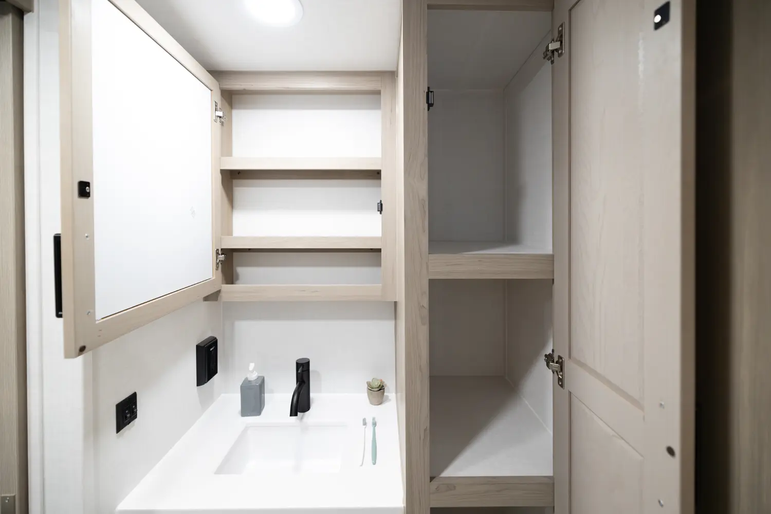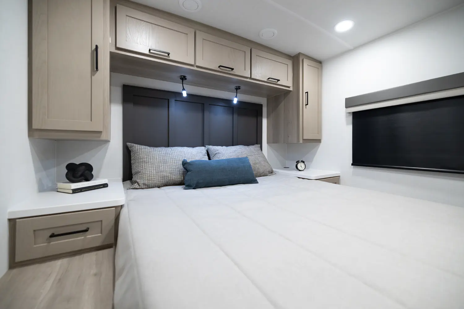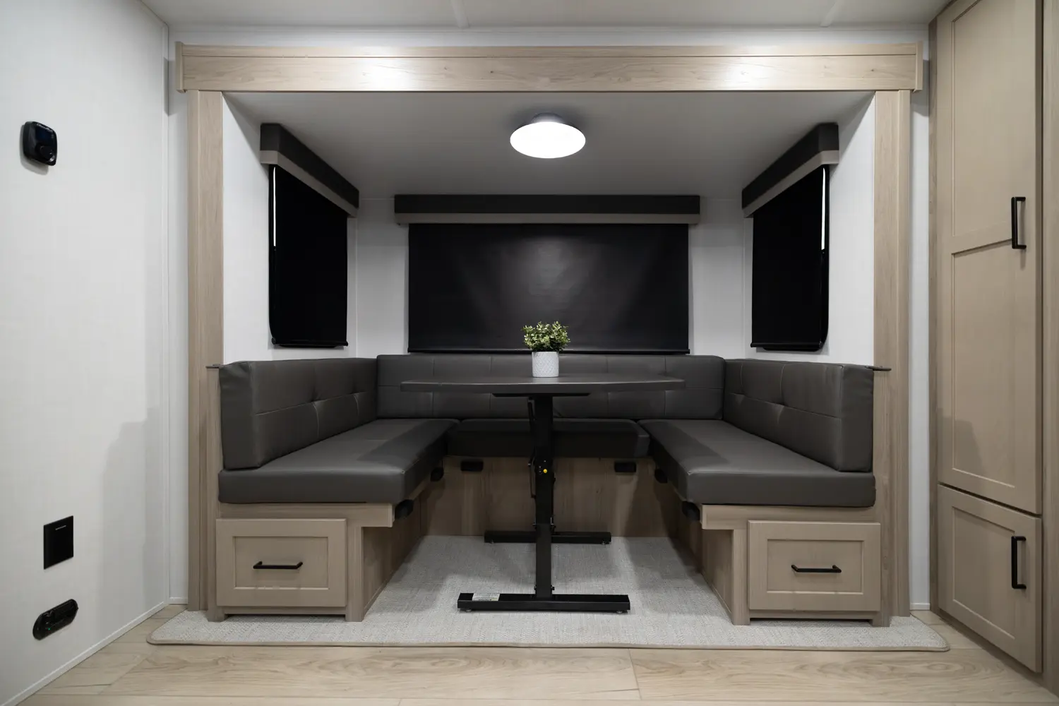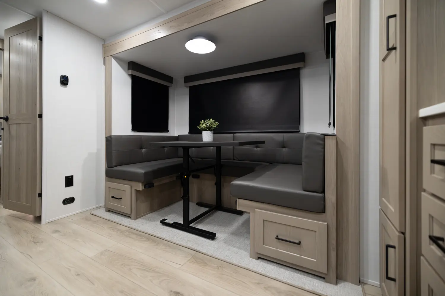 The 25FKB blends spacious comfort with smart design for a great value. The front kitchen offers abundant counter space and storage, perfect for meal prep and entertaining. The U-shaped dinette provides a roomy dining area that can convert to extra sleeping space. (optional Hide-a-Bed or Theater seating) The pass-through bathroom comes equipped with a large rectangular shower, and the rear bedroom gives you a private retreat on the road.