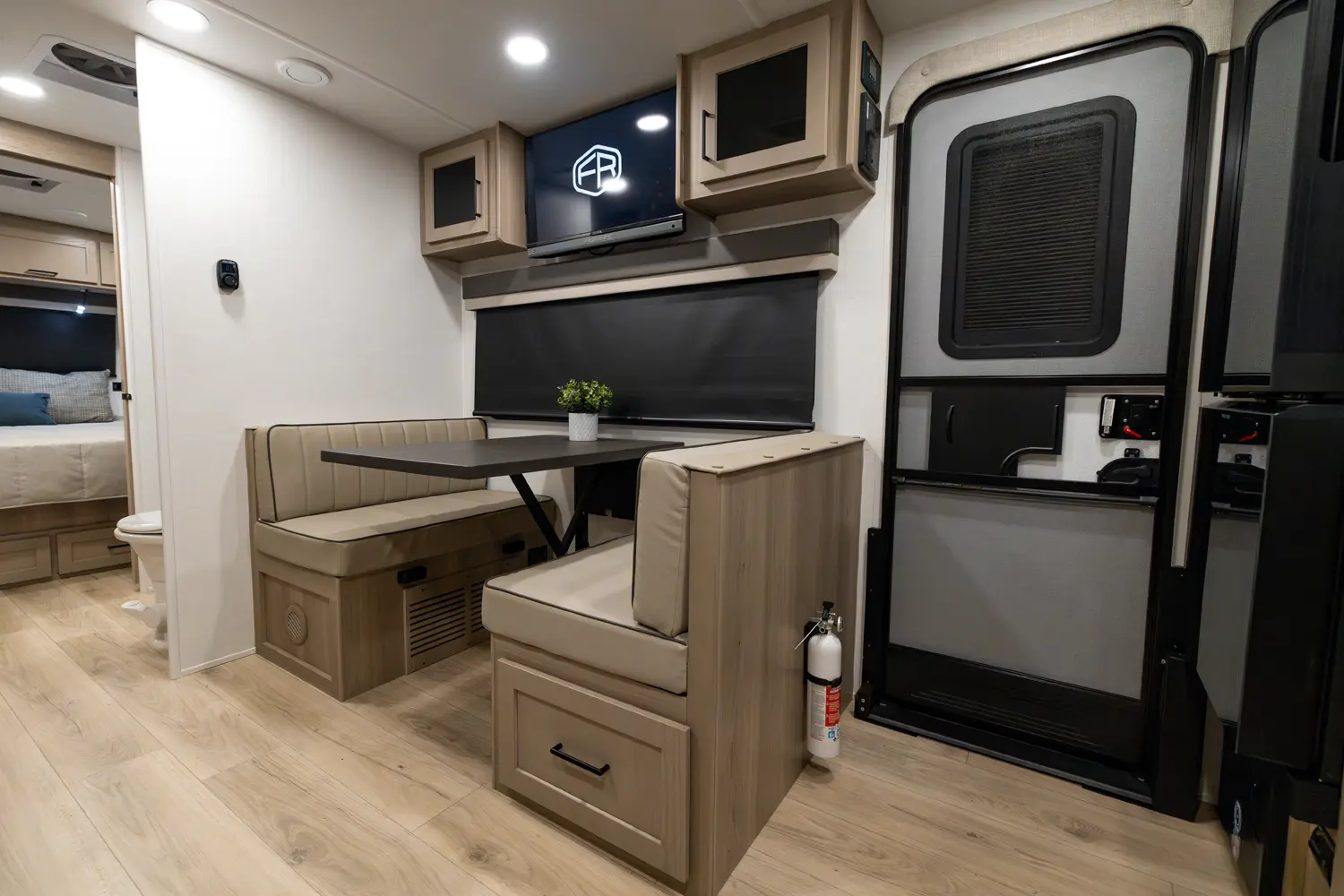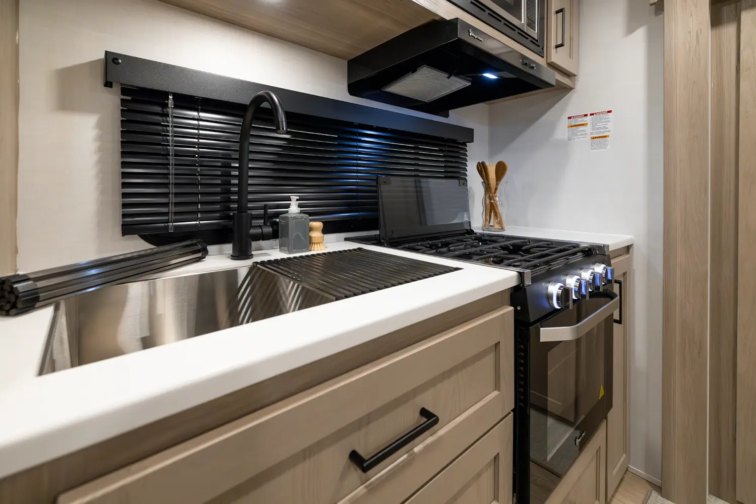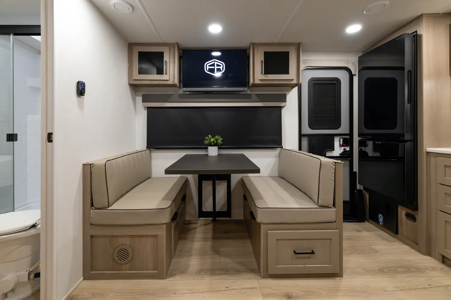 The 25SRK offers a spacious convenient layout with two entry doors providing easy access to the kitchen, bedroom, and bathroom, all while the slides are retracted. The rear kitchen features ample counter space while the living area includes a U-shaped dinette and theater seating. (optional hide-a-bed) The wardrobe slide adds generous storage making this a perfect choice for families or couples seeking flexibility and functionality on the road.