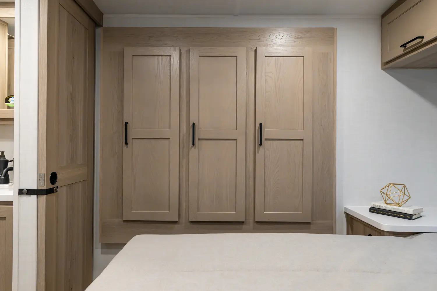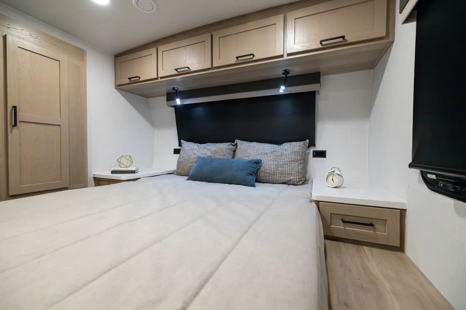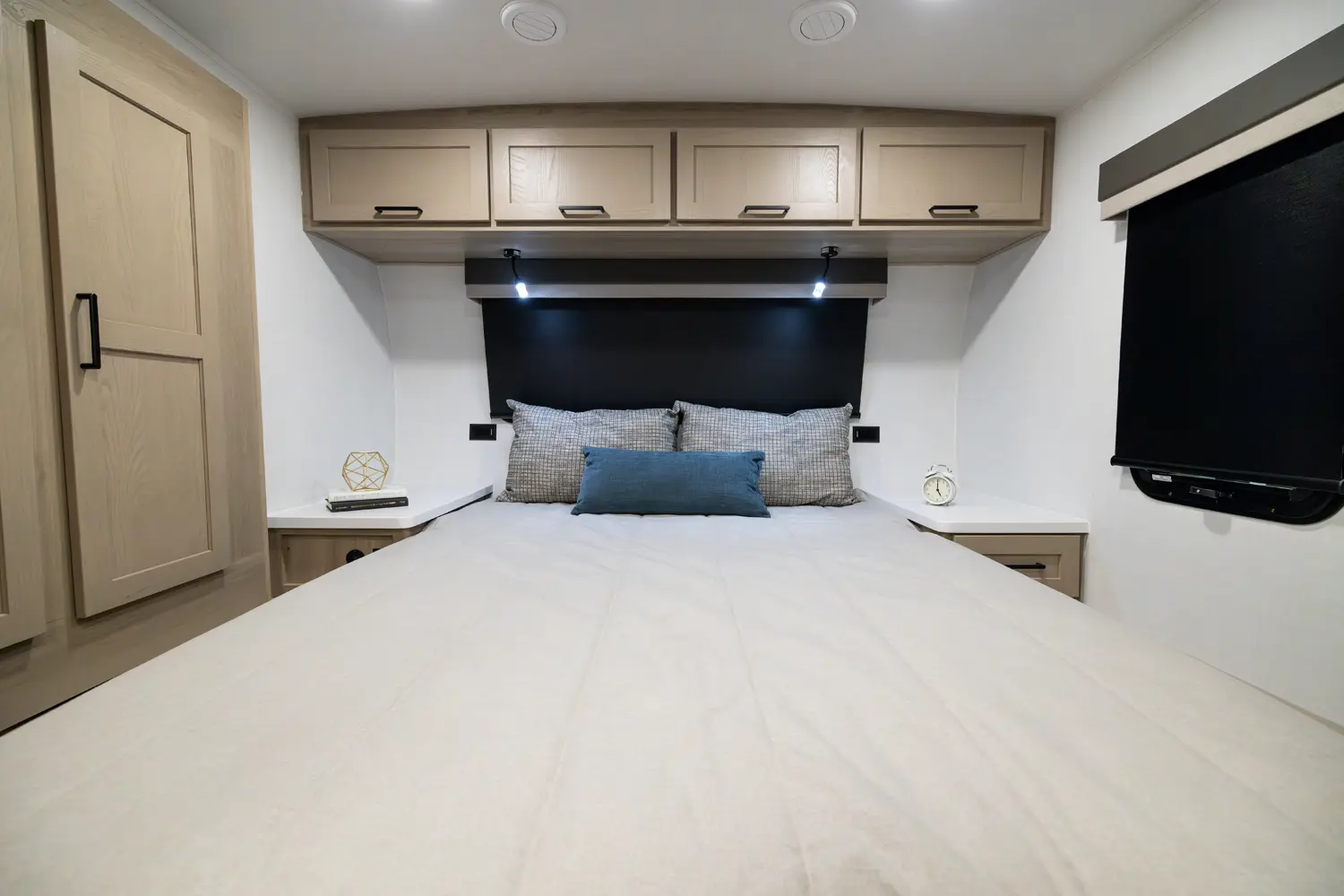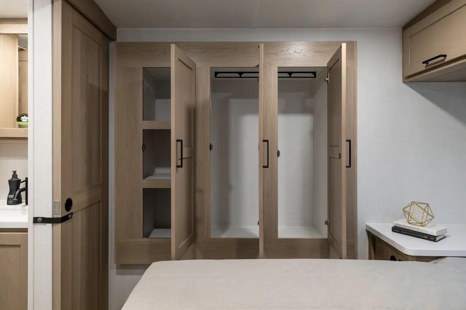 The 25SRK offers a spacious convenient layout with two entry doors providing easy access to the kitchen, bedroom, and bathroom, all while the slides are retracted. The rear kitchen features ample counter space while the living area includes a U-shaped dinette and theater seating. (optional hide-a-bed) The wardrobe slide adds generous storage making this a perfect choice for families or couples seeking flexibility and functionality on the road.