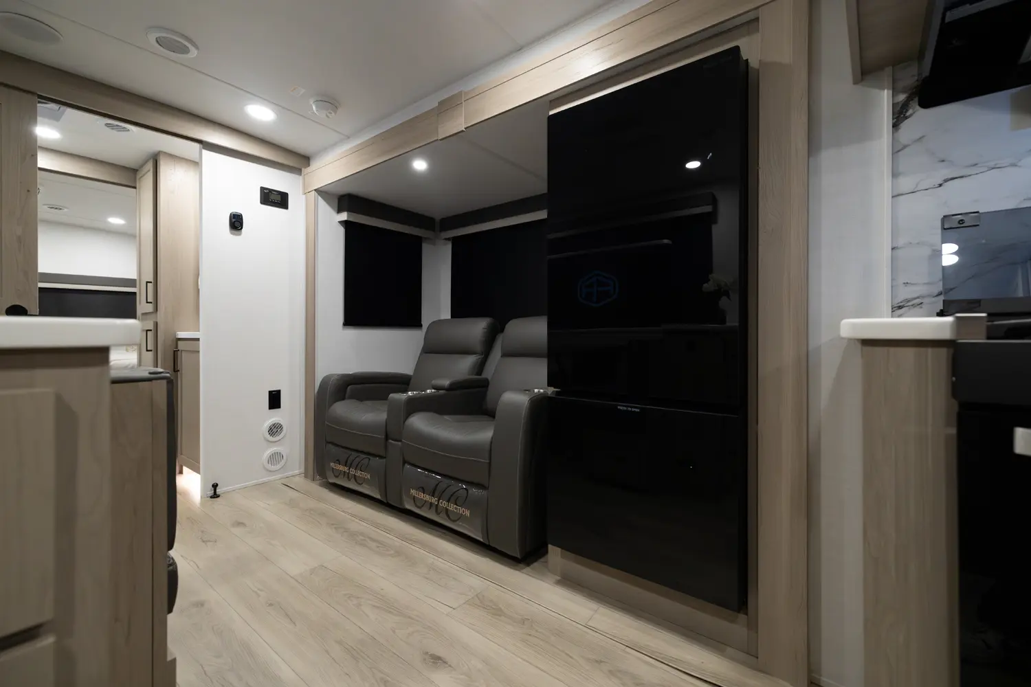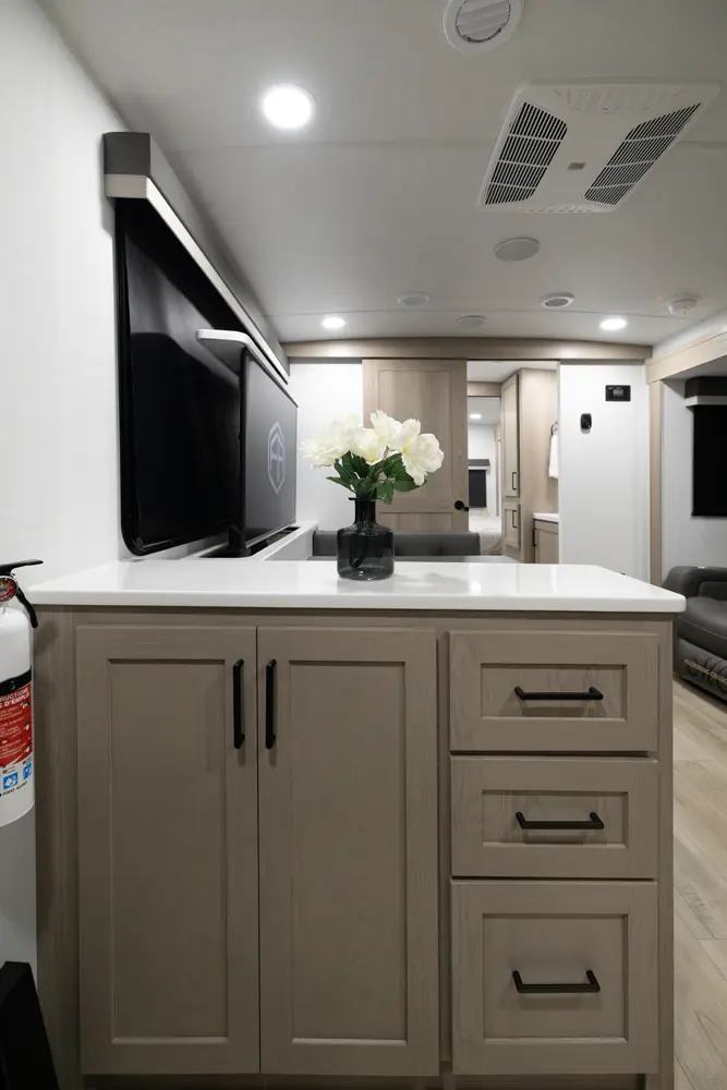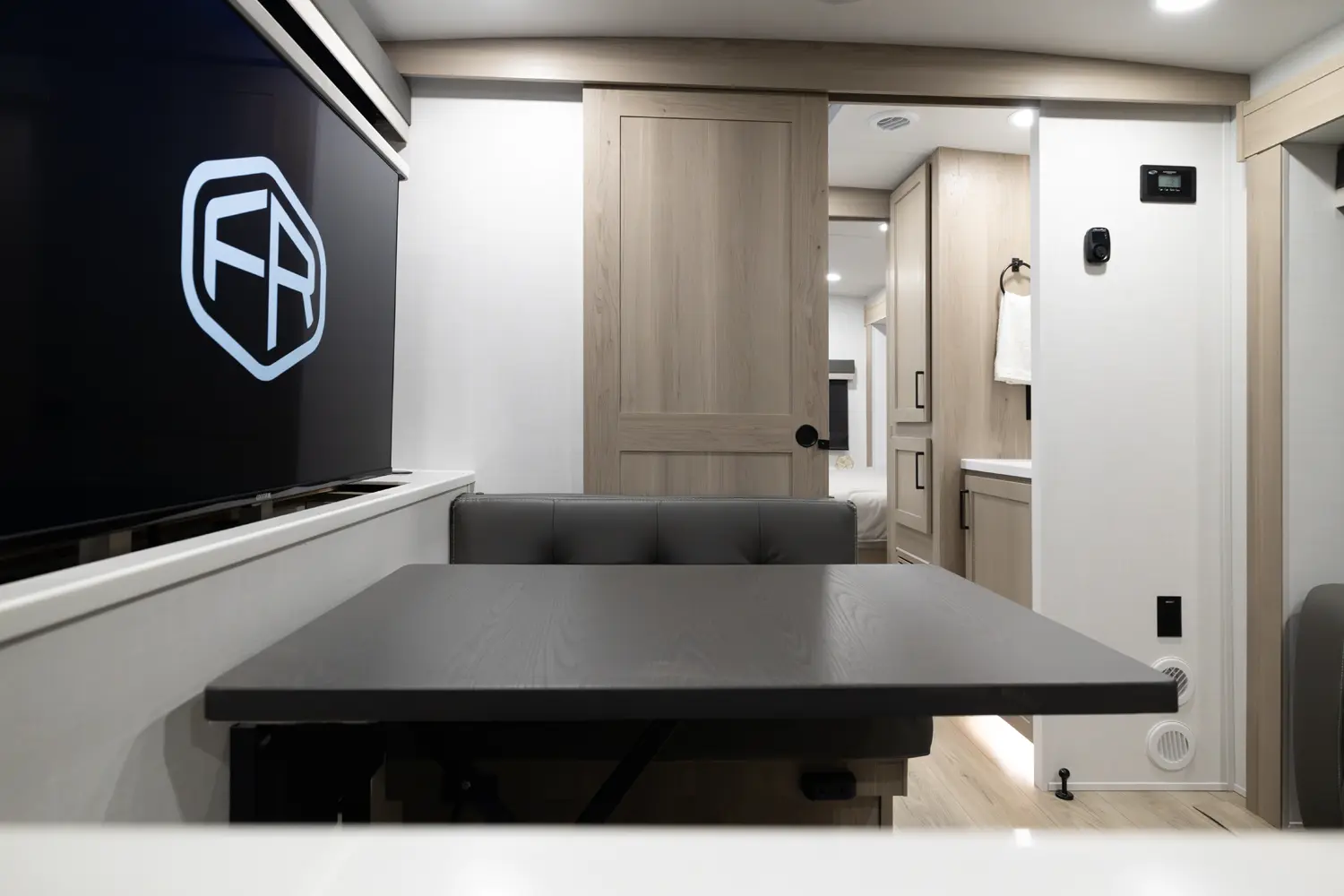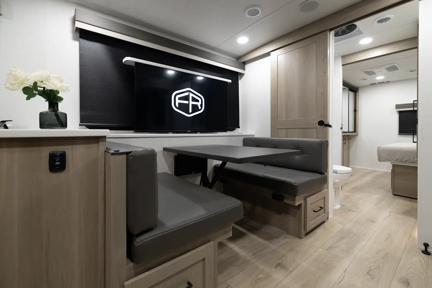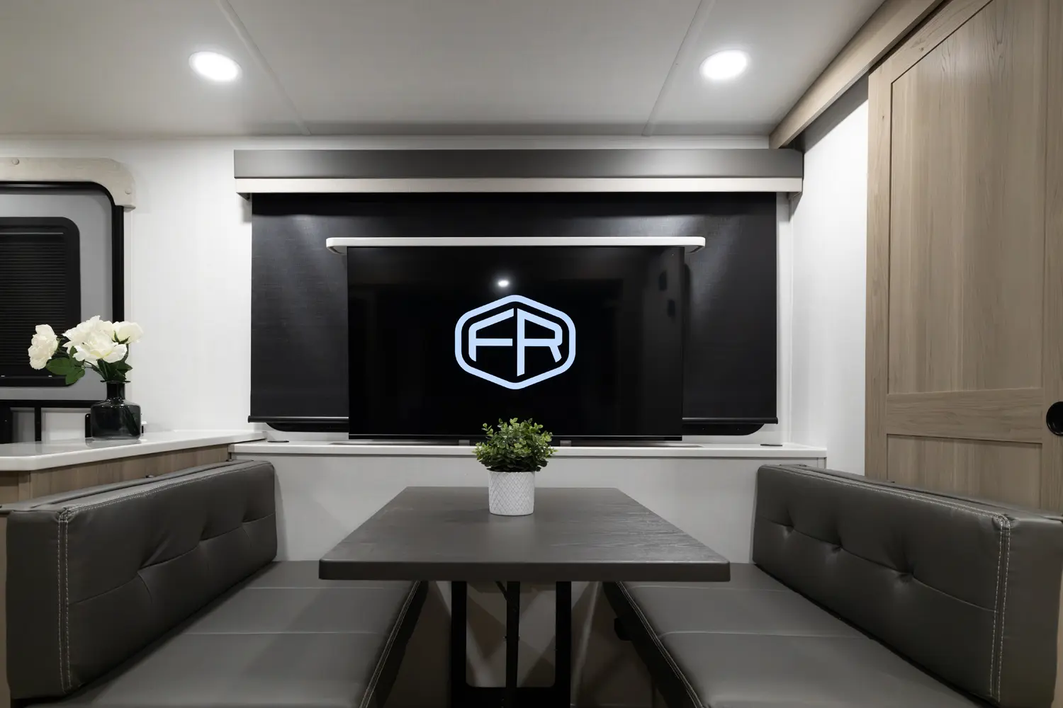 The 26FK is a front kitchen floorplan with dual entry doors, giving easy access to the bedroom, large pass-through bathroom, and kitchen even when slides are in. The living area features theater seating and a dinette with an adjustable Televator, which raises for TV viewing or lowers to enjoy the campsite window views. A rear bedroom with a true queen bed slide completes this thoughtful, family-friendly layout designed for comfort and convenience on the road.
