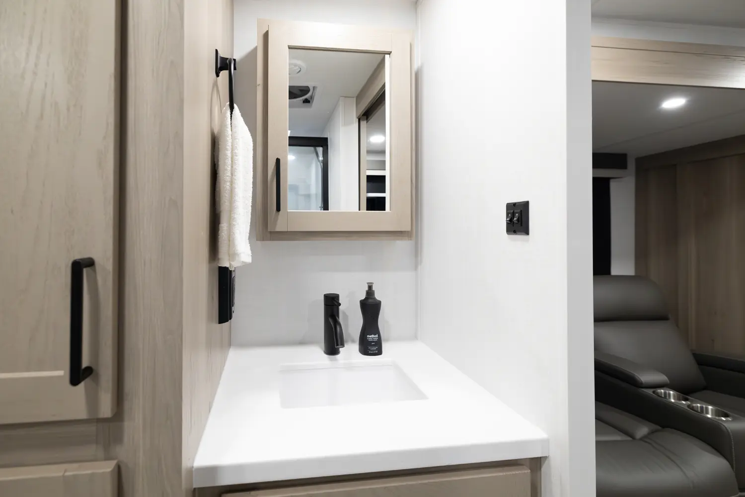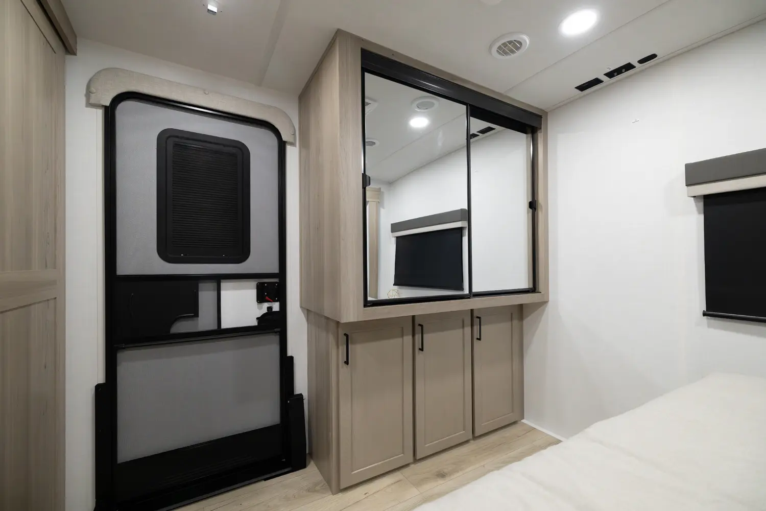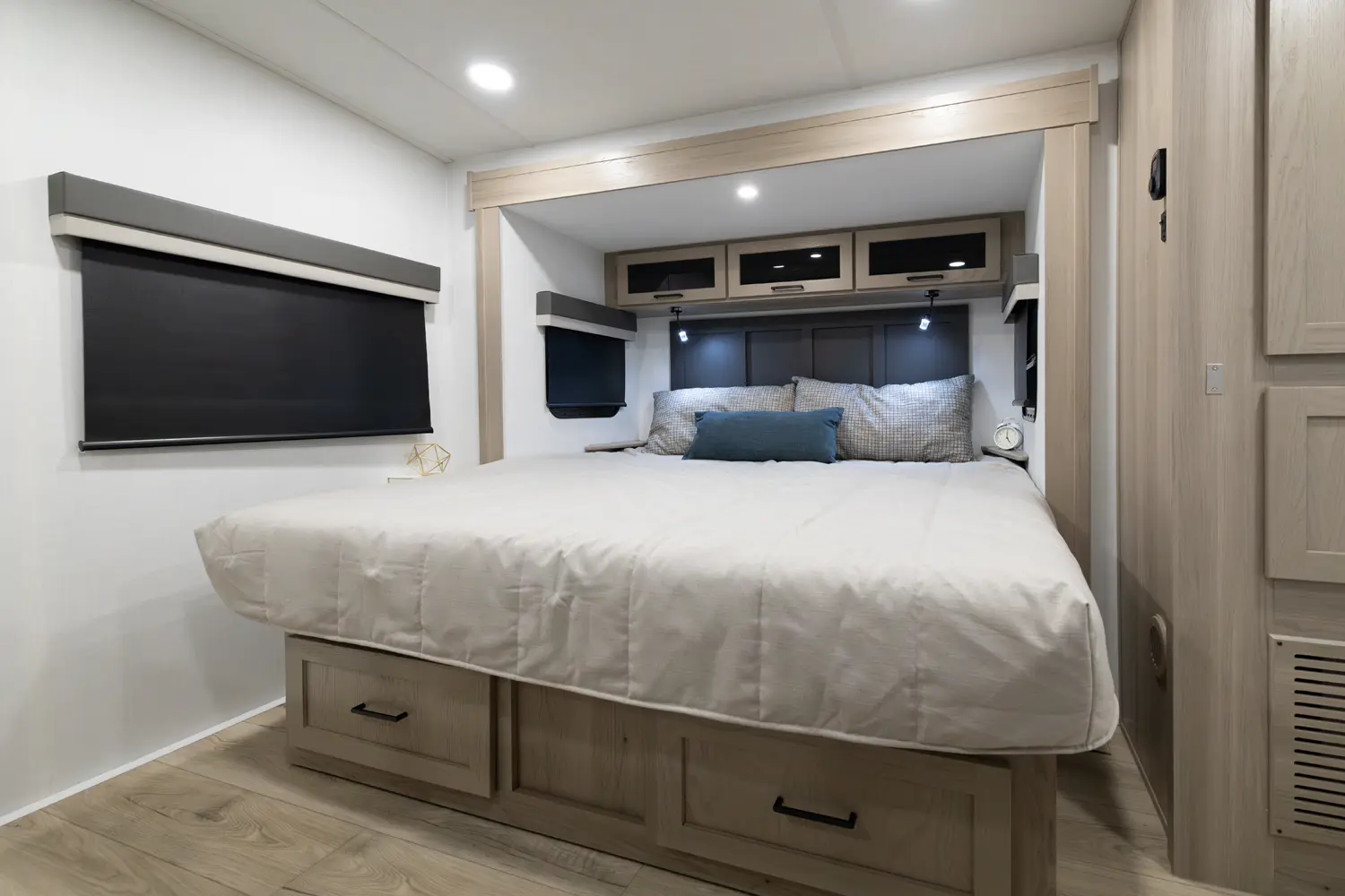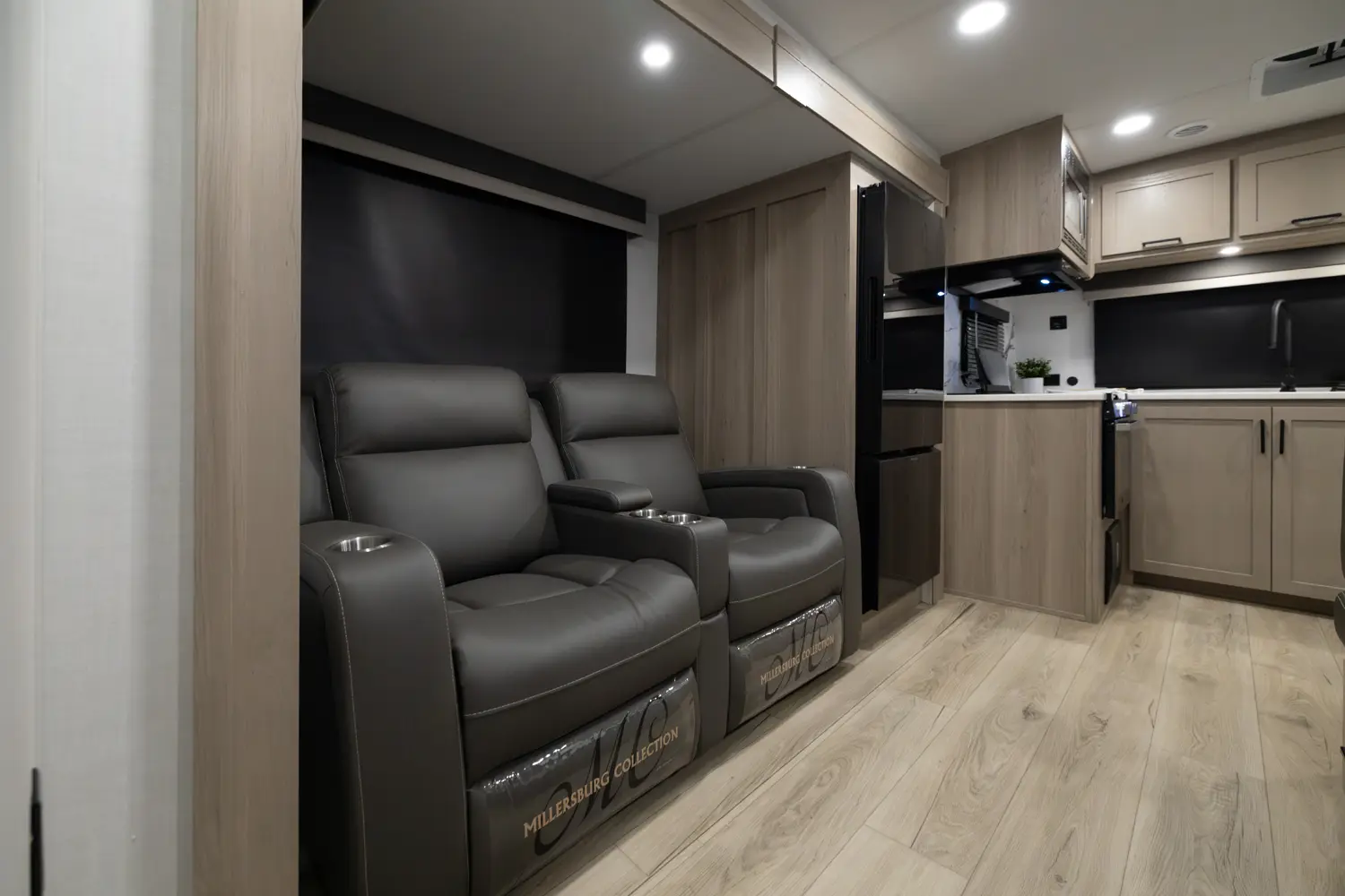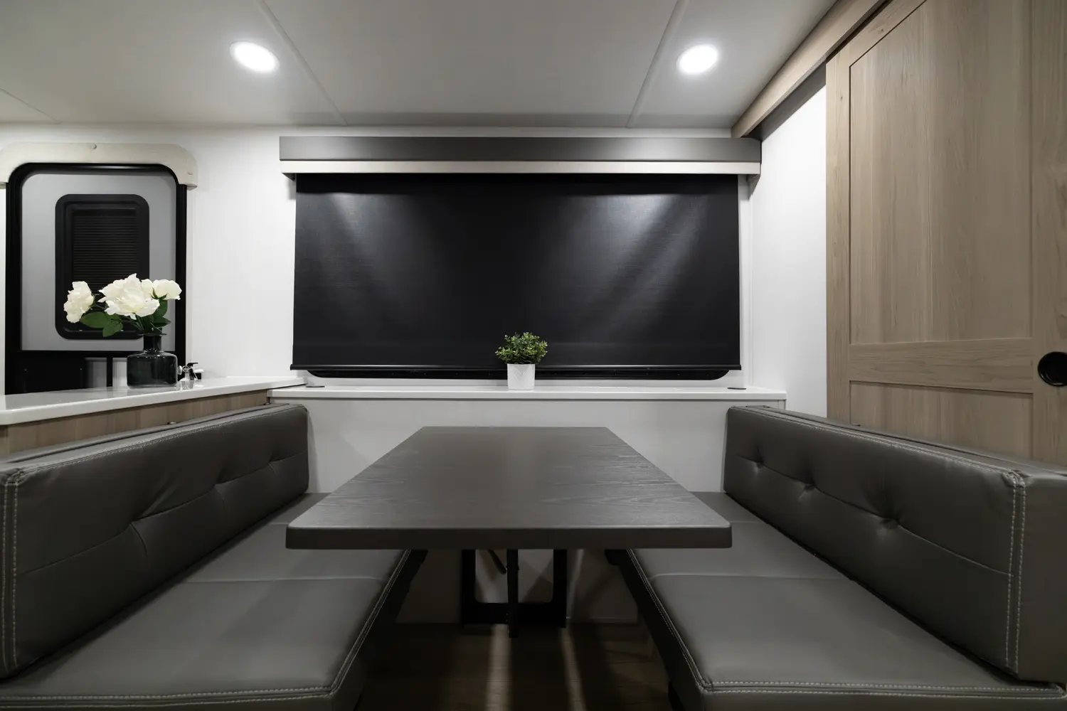 The 26FK is a front kitchen floorplan with dual entry doors, giving easy access to the bedroom, large pass-through bathroom, and kitchen even when slides are in. The living area features theater seating and a dinette with an adjustable Televator, which raises for TV viewing or lowers to enjoy the campsite window views. A rear bedroom with a true queen bed slide completes this thoughtful, family-friendly layout designed for comfort and convenience on the road.