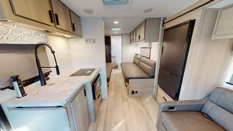The Forester TS2371 is the perfect couple's coach with twin beds, a rear full bathroom with a shower, and a wardrobe for your things. A love seat with table is perfect for dining, with a fully equipped kitchen that includes a stovetop, convection microwave, flip-up countertop for extra space, and a 10.7 CU FT 12 V residential-style stainless steel refrigerator. The rear bath includes a 24" x 36" skylight shower, commode, vanity sink with extended countertop, and medicine cabinet.