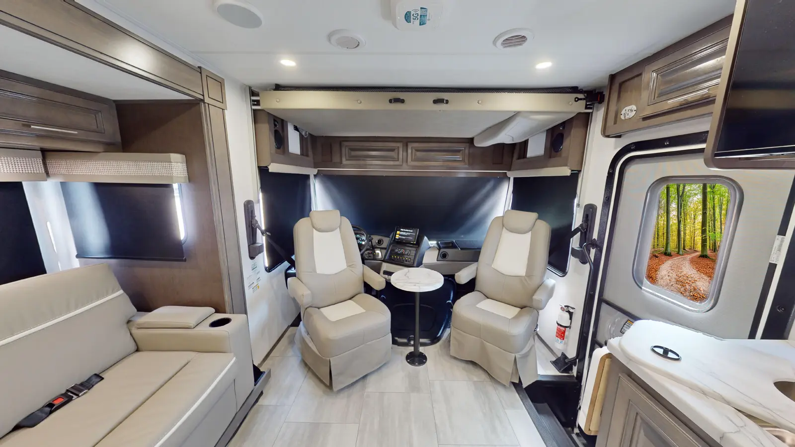 Choose from two thoughtfully designed floorplans, each paired with two elegant décor options, allowing you to tailor your motorhome to your unique style. Key standard features include: Automatic hydraulic leveling jacks for effortless setup; Color side and rear cameras for enhanced visibility and safety; LED TVs in the bedroom and main living area for entertainment on the road; Custom countertops and a premium Sony dash entertainment system with AM/FM, Bluetooth, and USB connectivity.