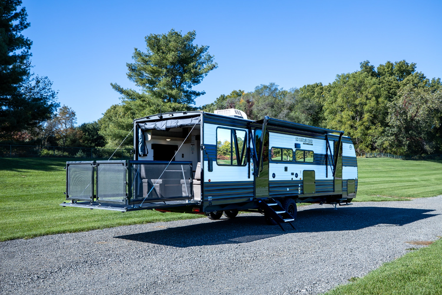 • Cherokee Black Label Grey Wolf (Deep Tinted Frameless Automotive Glass Windows, High Gloss Gel Coat Exterior Sidewalls, Multicolor Reading Lights, Pillowtop Mattress Upgrade, Power Tongue Jack, Pull Out Sprayer Faucet, Solid Surface Countertops, Thermo Foil Arctic Insulation)
