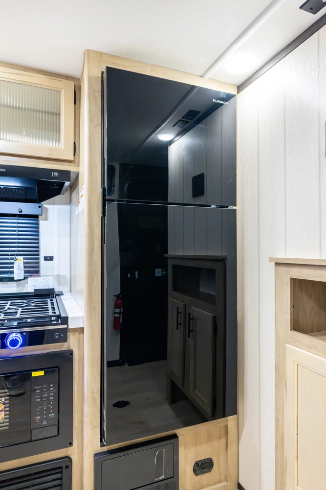 The Grey Wolf Toy Hauler by Forest River is the perfect RV for outdoor enthusiasts. The spacious garage can accommodate your toys, while the outdoor kitchen, shower, and patio area provide the ultimate outdoor living experience. Inside, you'll find a luxurious bedroom with a walk-around queen bed and a well-appointed bathroom. The modern kitchen, with its black stainless steel farm sink and sink cover, is perfect for cooking and entertaining.