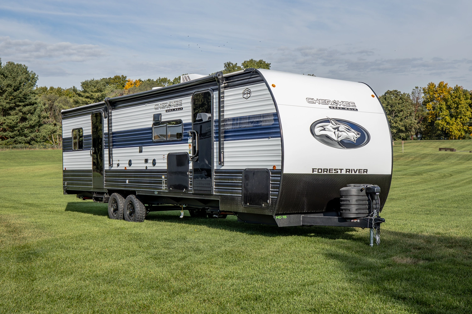 • Cherokee Black Label Grey Wolf (Deep Tinted Frameless Automotive Glass Windows, High Gloss Gel Coat Exterior Sidewalls, Multicolor Reading Lights, Pillowtop Mattress Upgrade, Power Tongue Jack, Pull Out Sprayer Faucet, Solid Surface Countertops, Thermo Foil Arctic Insulation)