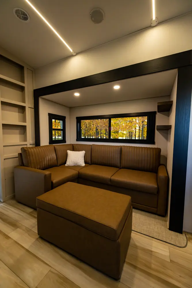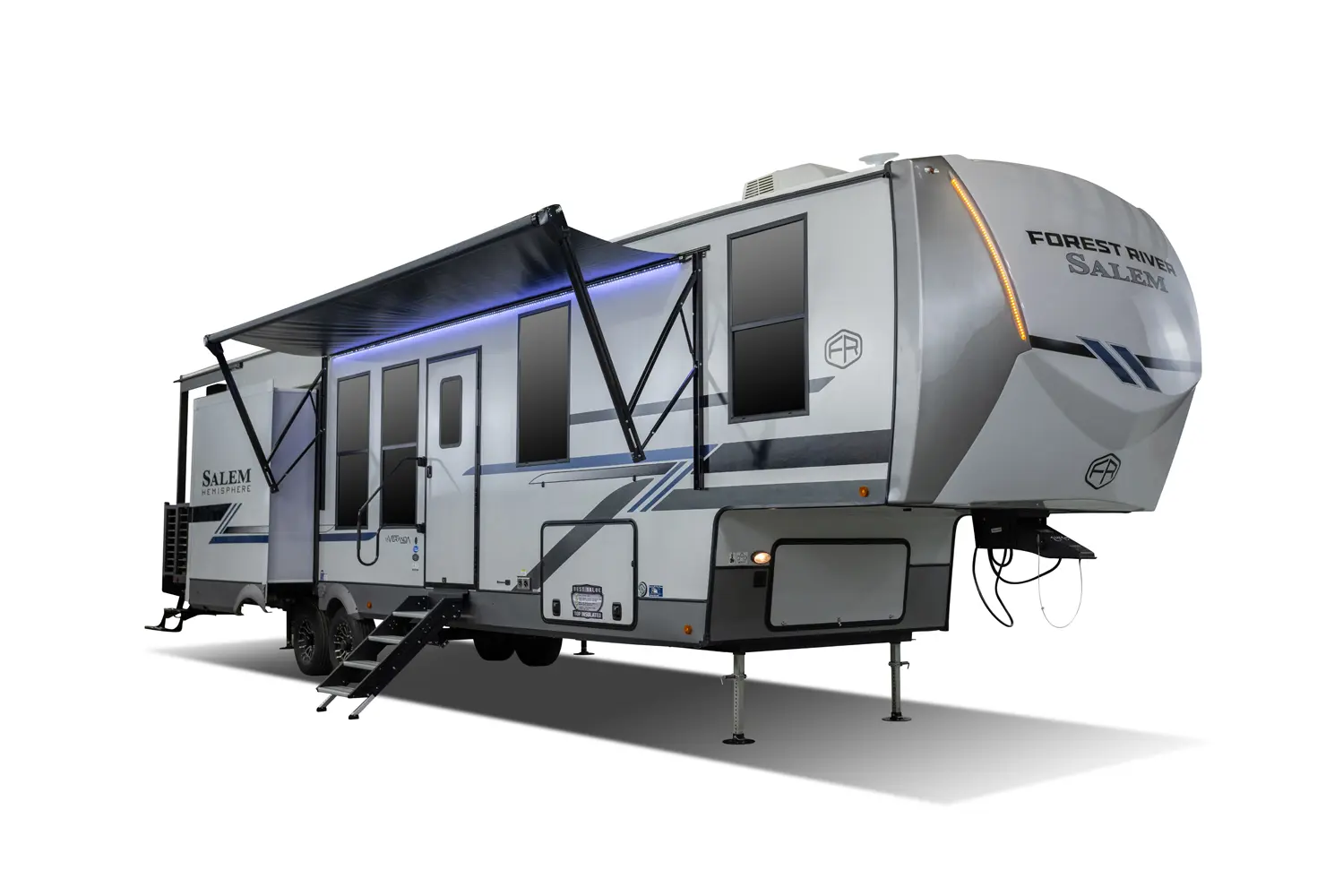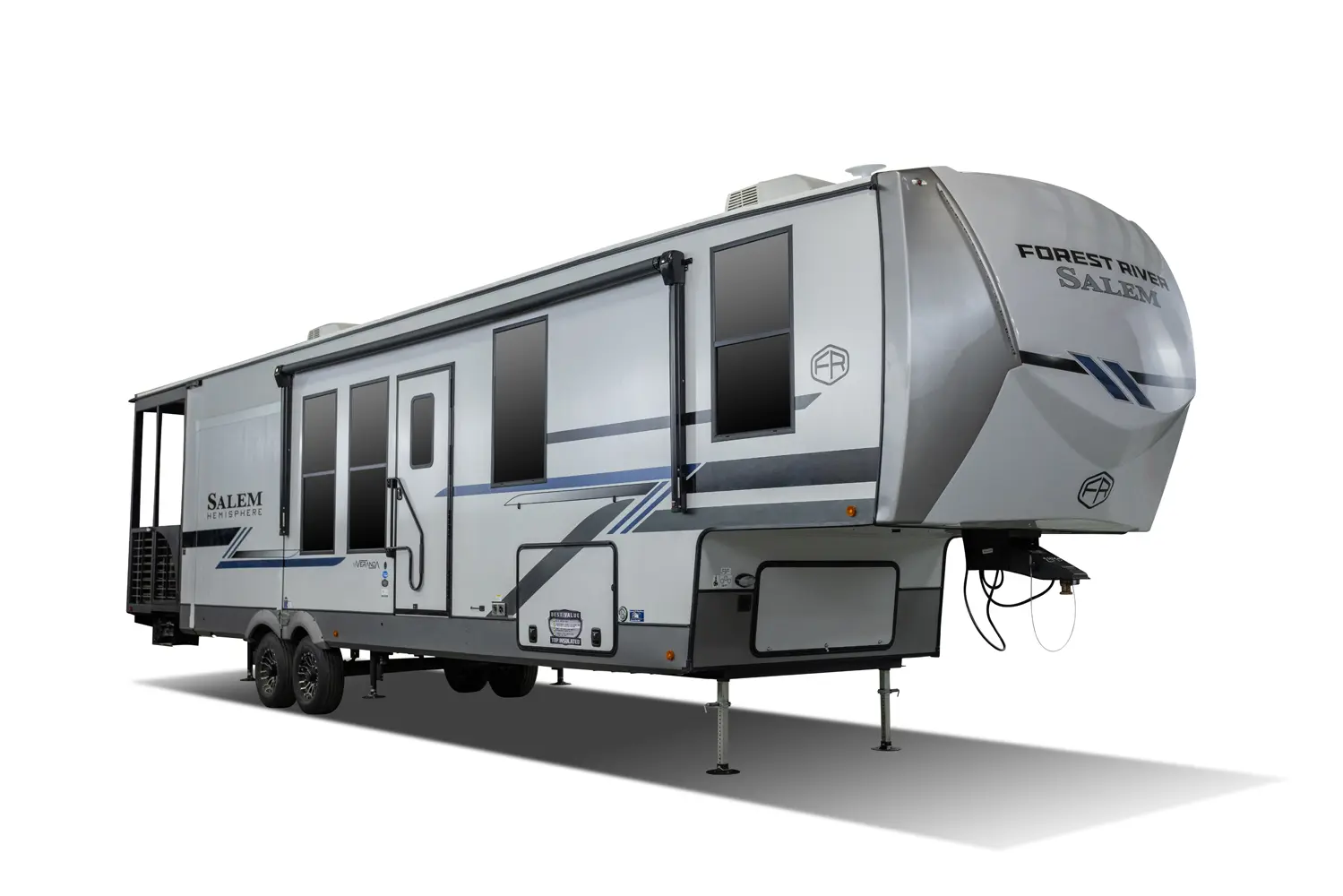 The Hemisphere Fifth Wheels 38VERANDA floorplan has two entries and four slide outs. Exterior features include: fiberglass exterior and 17' awning. Interiors features include: kitchen island and front bedroom.