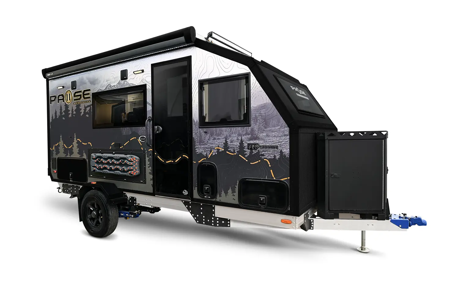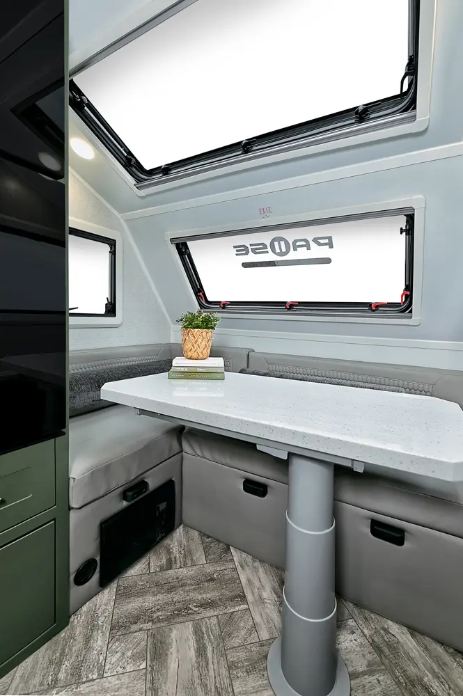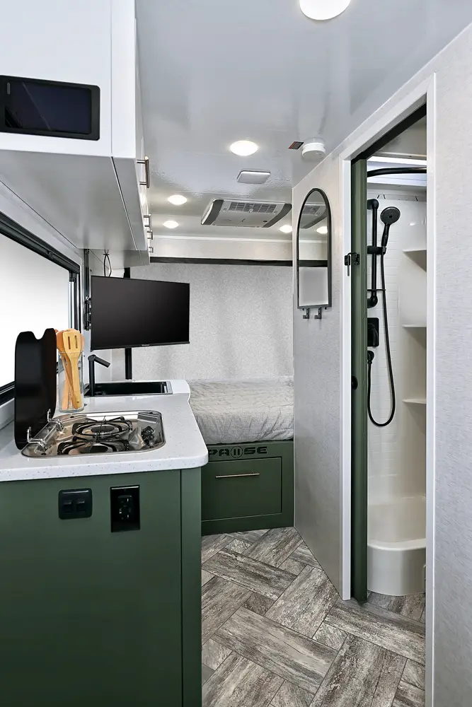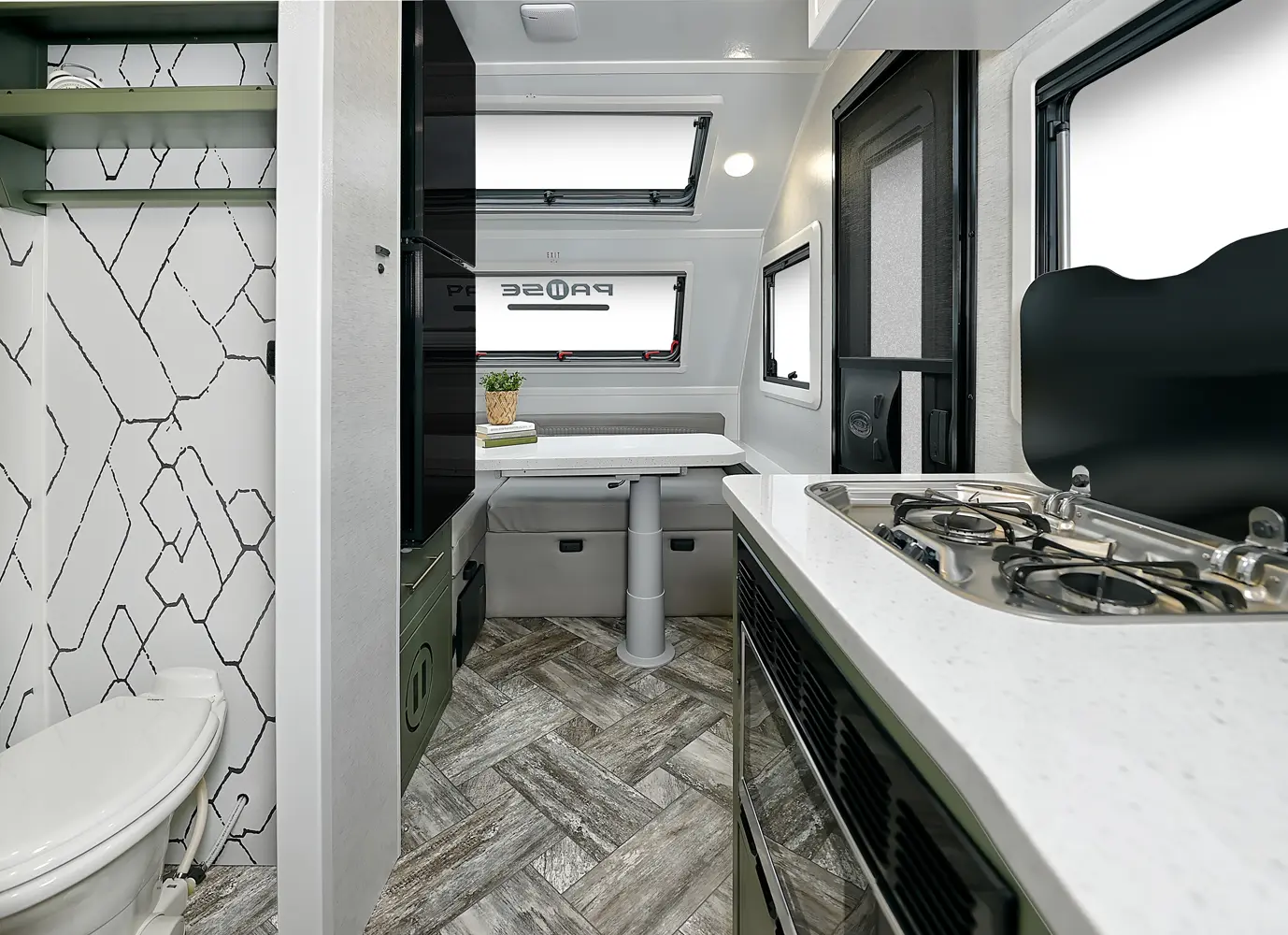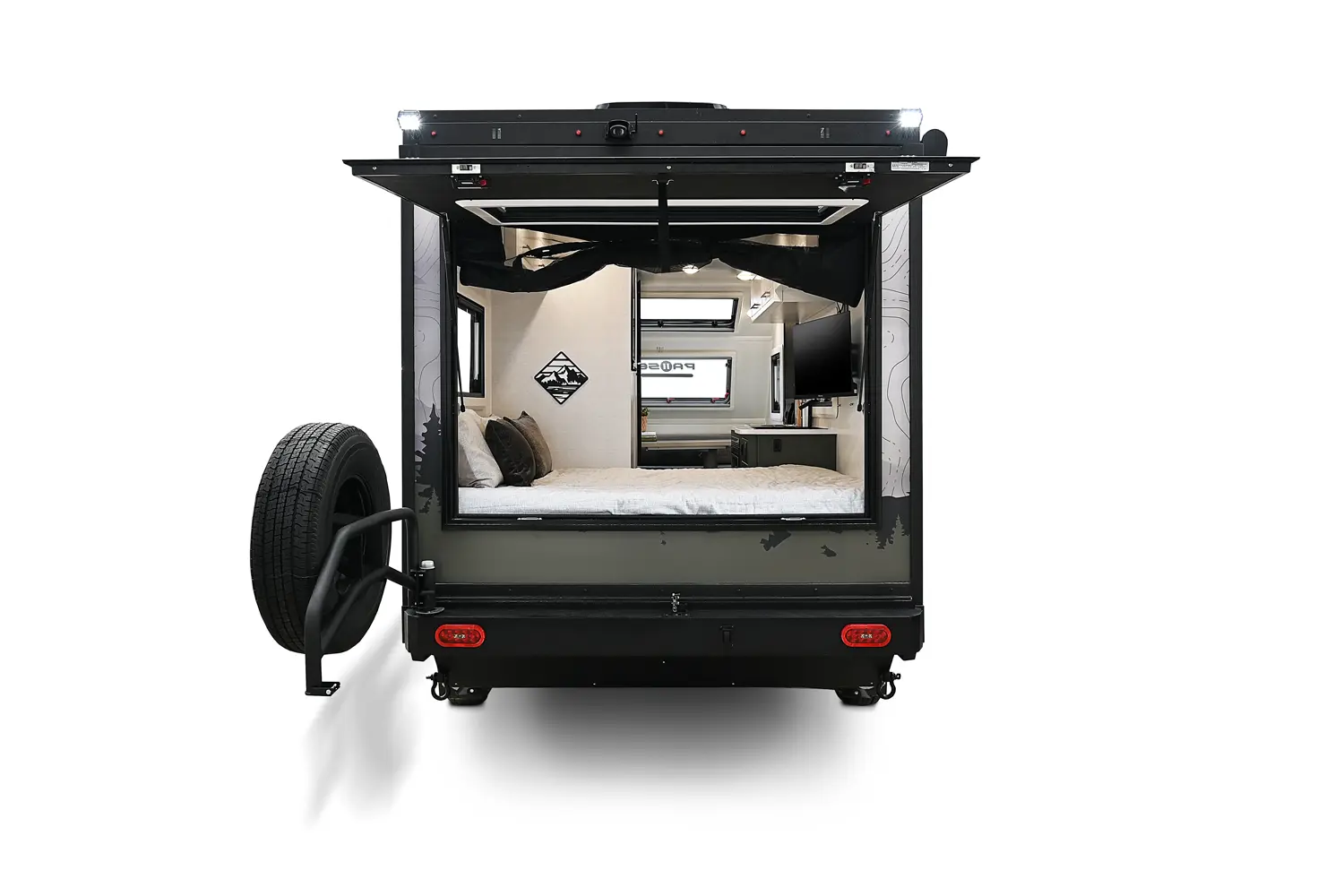 This 16.4 floorplan grants you all the amenities you need while on the road in a smaller footprint! An interior front dinette allows you seating area while enjoying a cooked meal and doubles as sleeping area for extra guests at night. You can enjoy cooking either inside or outside with this coach. A full size Queen bed in the back of this trailer with a rear wall opening up to the outdoors gives you comfort of sleeping inside, while feeling like you are in nature.