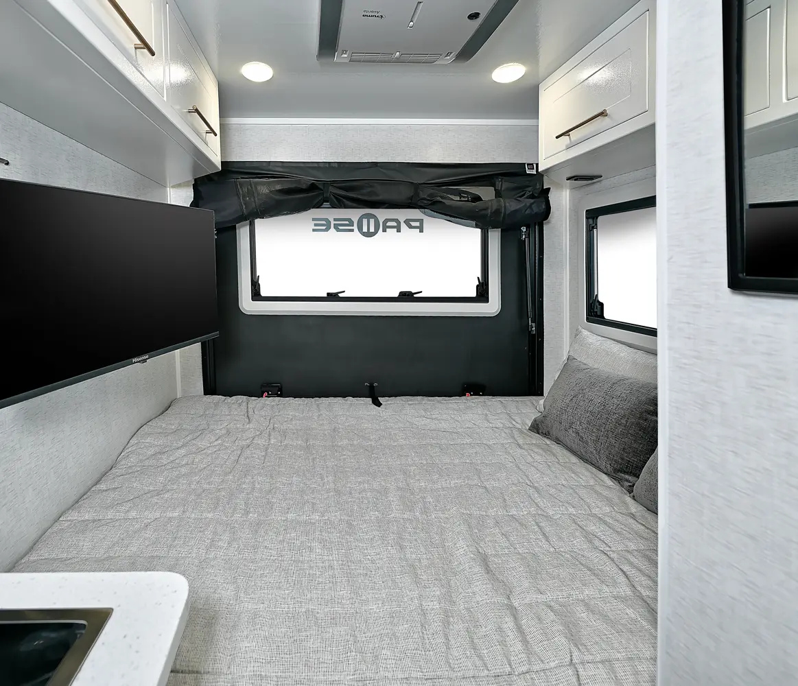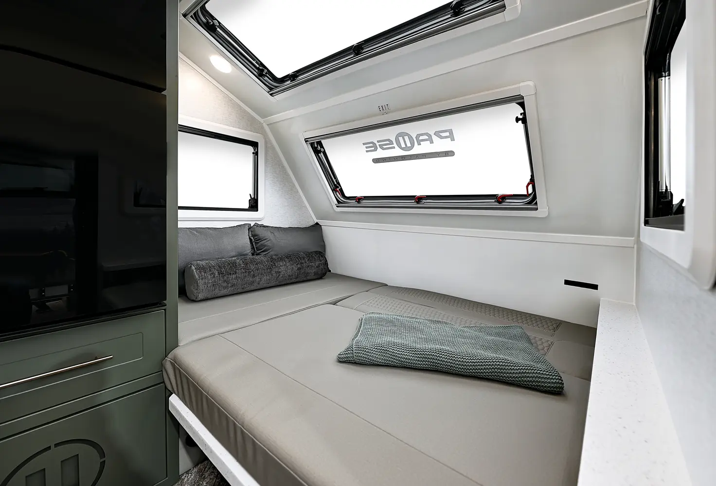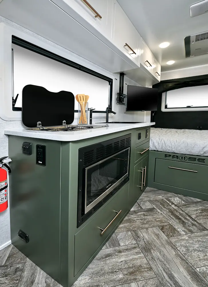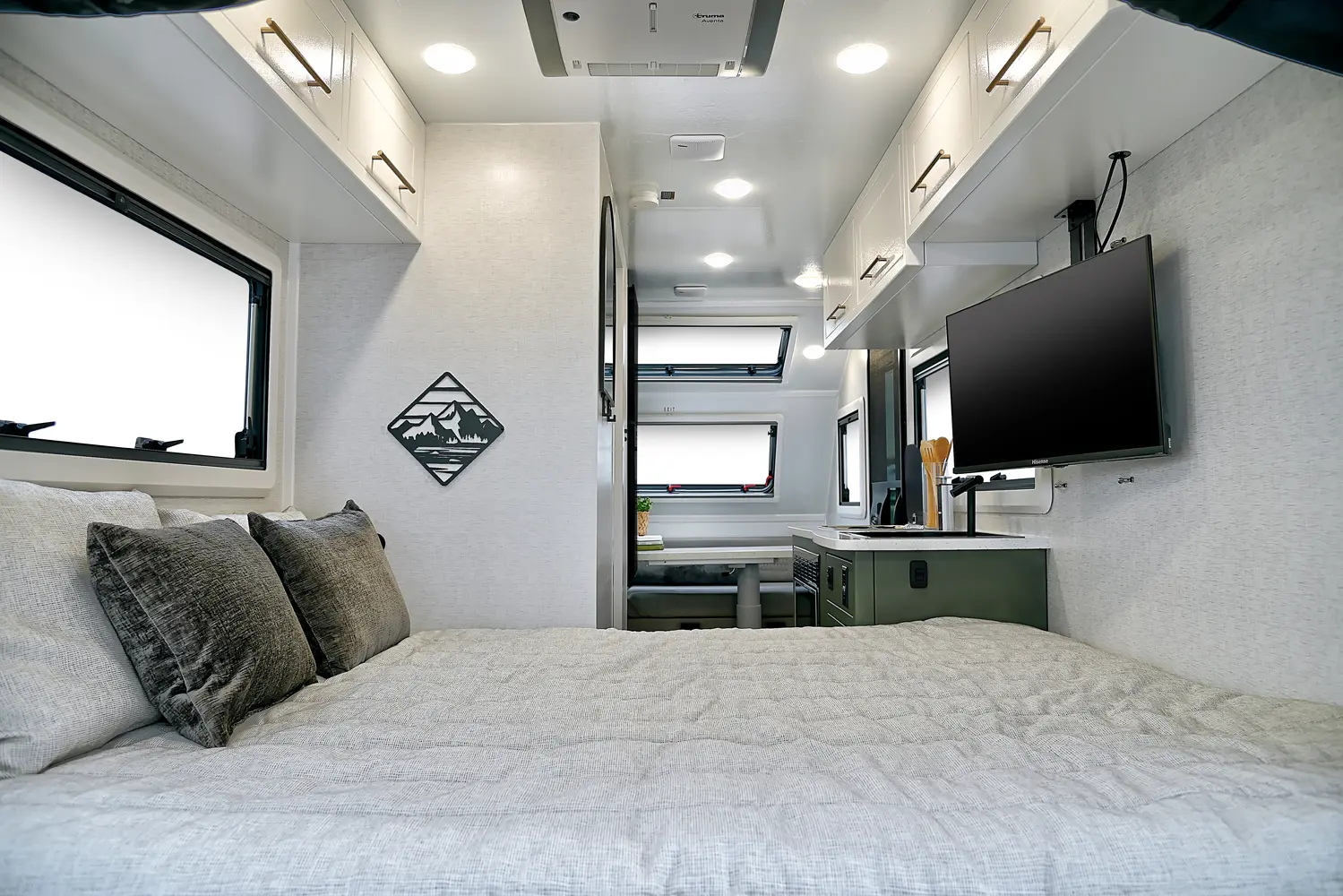 This 16.4 floorplan grants you all the amenities you need while on the road in a smaller footprint! An interior front dinette allows you seating area while enjoying a cooked meal and doubles as sleeping area for extra guests at night. You can enjoy cooking either inside or outside with this coach. A full size Queen bed in the back of this trailer with a rear wall opening up to the outdoors gives you comfort of sleeping inside, while feeling like you are in nature.