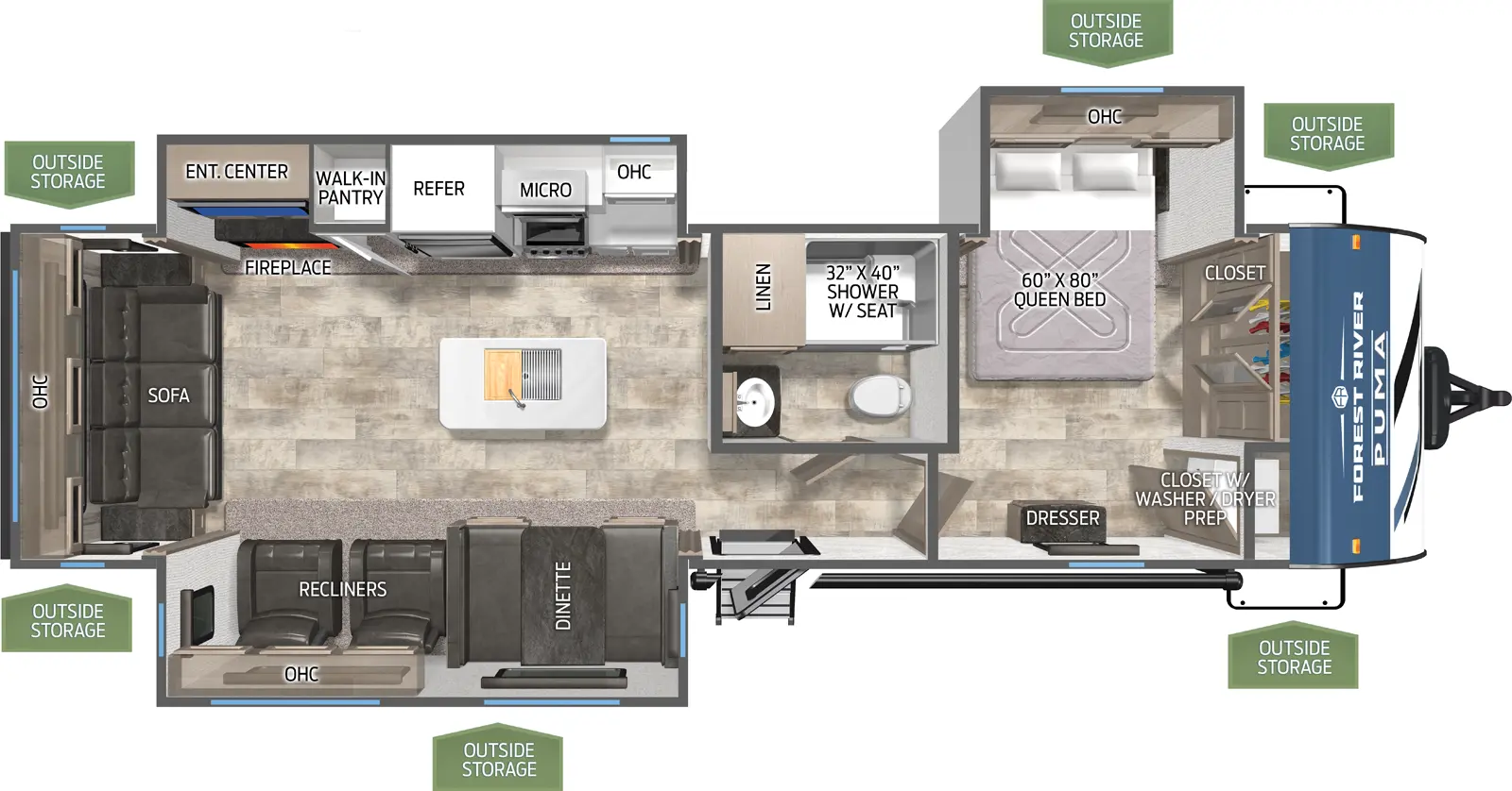 This rear living travel trailer has a sofa, recliners, and a dinette all in the rear of the camper. This spacious floor plan provides you with opposing slides that will make you feel as if you are right at home due to all of the space you receive. This island kitchen fifth wheel with an enormous rear window gives you a great vista of the back of your camper. To top things off, the front of the camper will have a slide out containing a queen bed, closet with washer/dryer prep and a full bathroom.