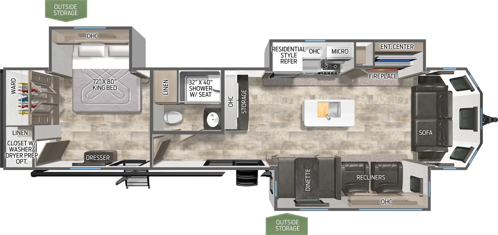 This Puma Destination Trailer features a front living area full of places to relax and feel like you're at home. Opposing slides grant you copious amounts of space in the front. With a sofa, recliners and a dinette, you will not have to fret about where guests can sit. In the rear of this floorplan, a slide out containing a full sized king bed provides a comfortable bedroom. Furthermore, A wardrobe along with a closet with washer/dryer prep can be found very useful for all of your belongings.