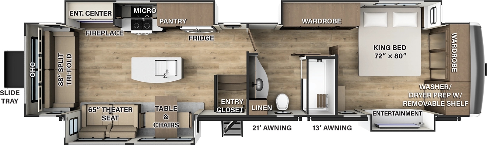 The F393RL is the biggest couples coach Elite Estate has to offer. This floorplan provides a large bedroom with a king size bed. The full-length closest provides the most interior storage of any floorplan offered. The kitchen provides residential appliances, including a fridge with ice maker, 24” 4 burner range with oven, 30” microwave and dishwasher prep for an 18” residential dishwasher in the island. It has a plush 88” tri fold 50/50 split sofa, theater seat and 50” entertainment TV.