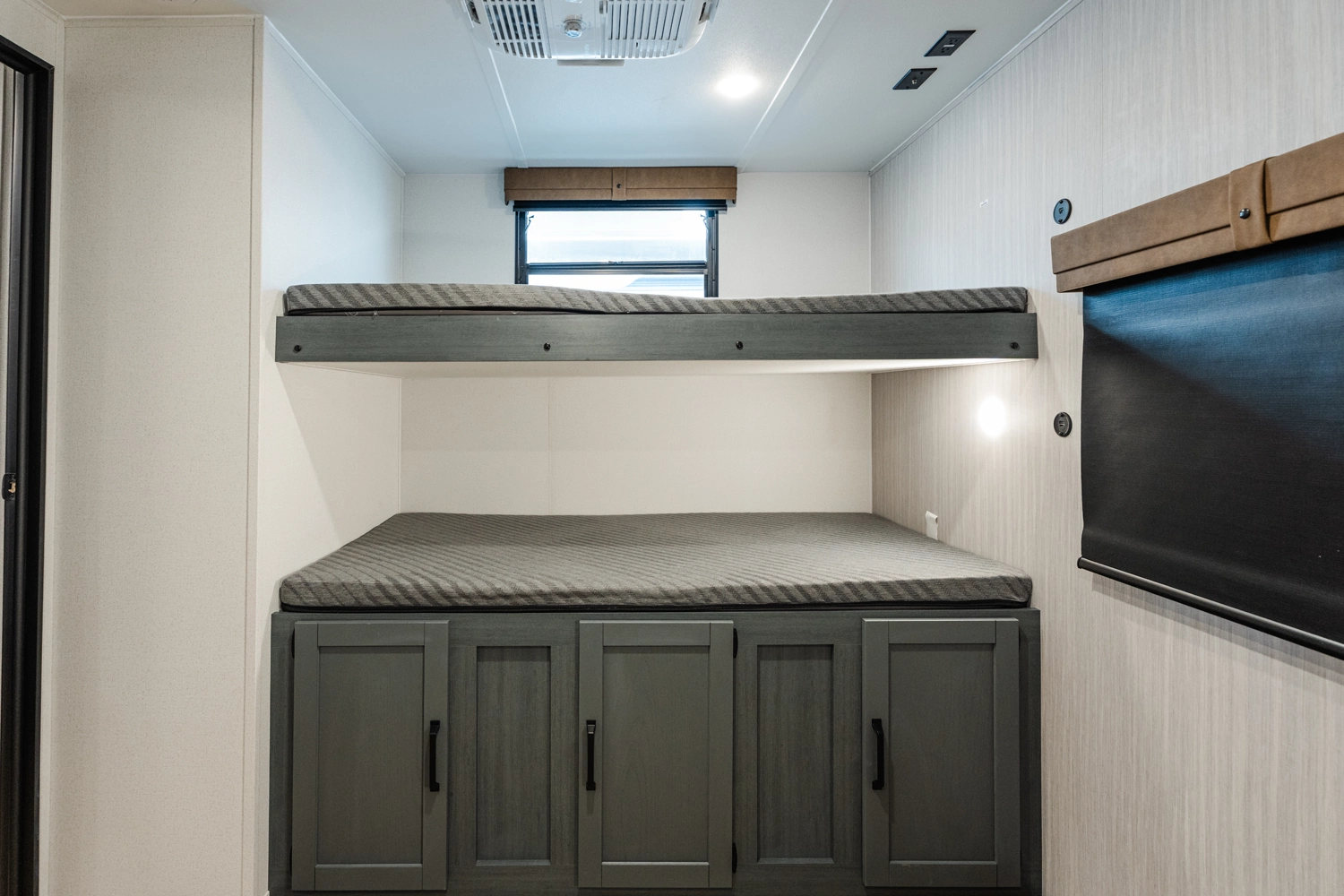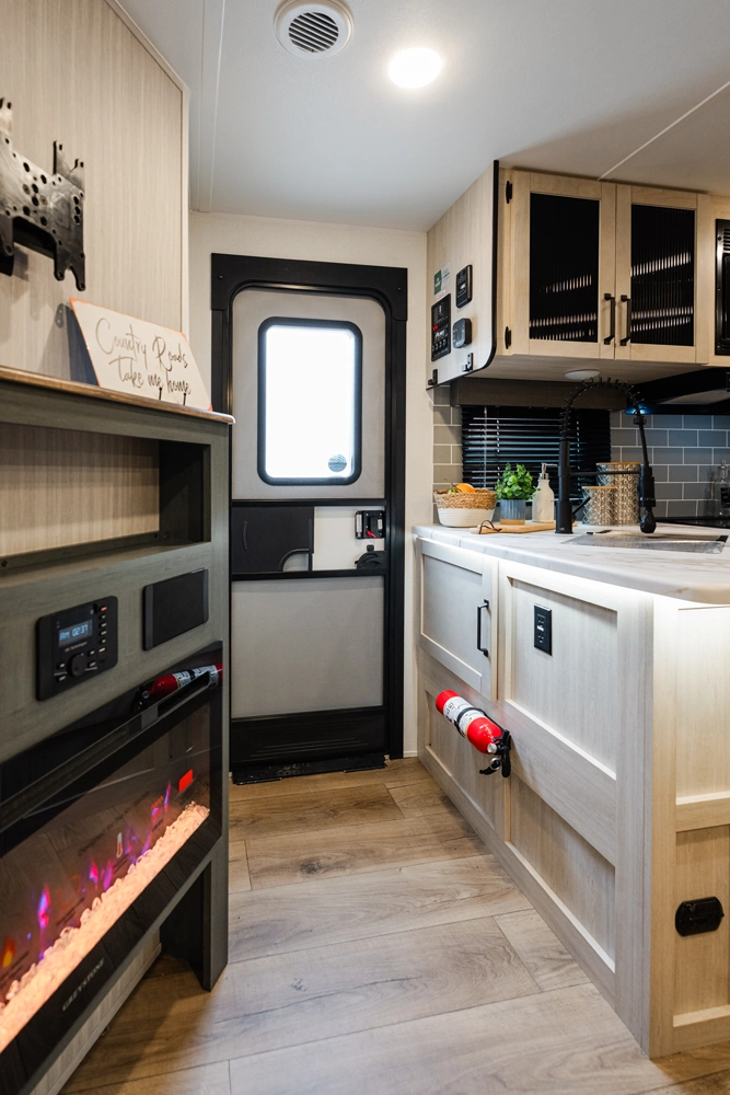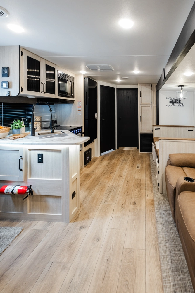 This bunk house travel trailer supplies you a great deal of space in the front bedroom. With a slide out and a large closet for all of your clothes, it will feel like your bedroom at home. The bunk house in the rear provides space for all guests to be comfortable and to make things a cut above, this floor plan provides two bathrooms. Furthermore, the exterior mini camp kitchen features a fridge and a griddle for those of you who like to cook in nature.