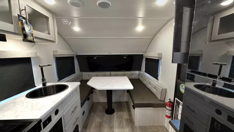 The RP-204 offers compact luxury for modern adventurers. A queen bed in the rear slide-out and a swivel dinette in the front provide flexible sleeping and living spaces. The walk-through bath adds convenience, while the kitchen features a convection microwave and 12V refrigerator. Exterior amenities include a 16' power awning and hot & cold spray port—perfect for couples or small families seeking adventure.