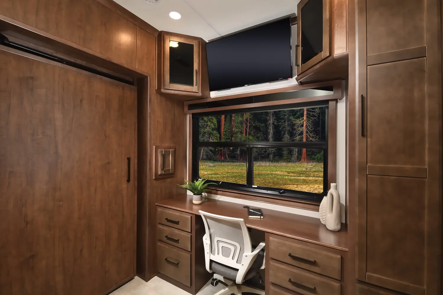 The RIVERSTONE 44DBL floorplan has two entries and four slide outs. Exterior features include: fiberglass exterior. Interiors features include: free-standing dinette option, front bedroom, murphy bed, rear bathroom and two full bathrooms.