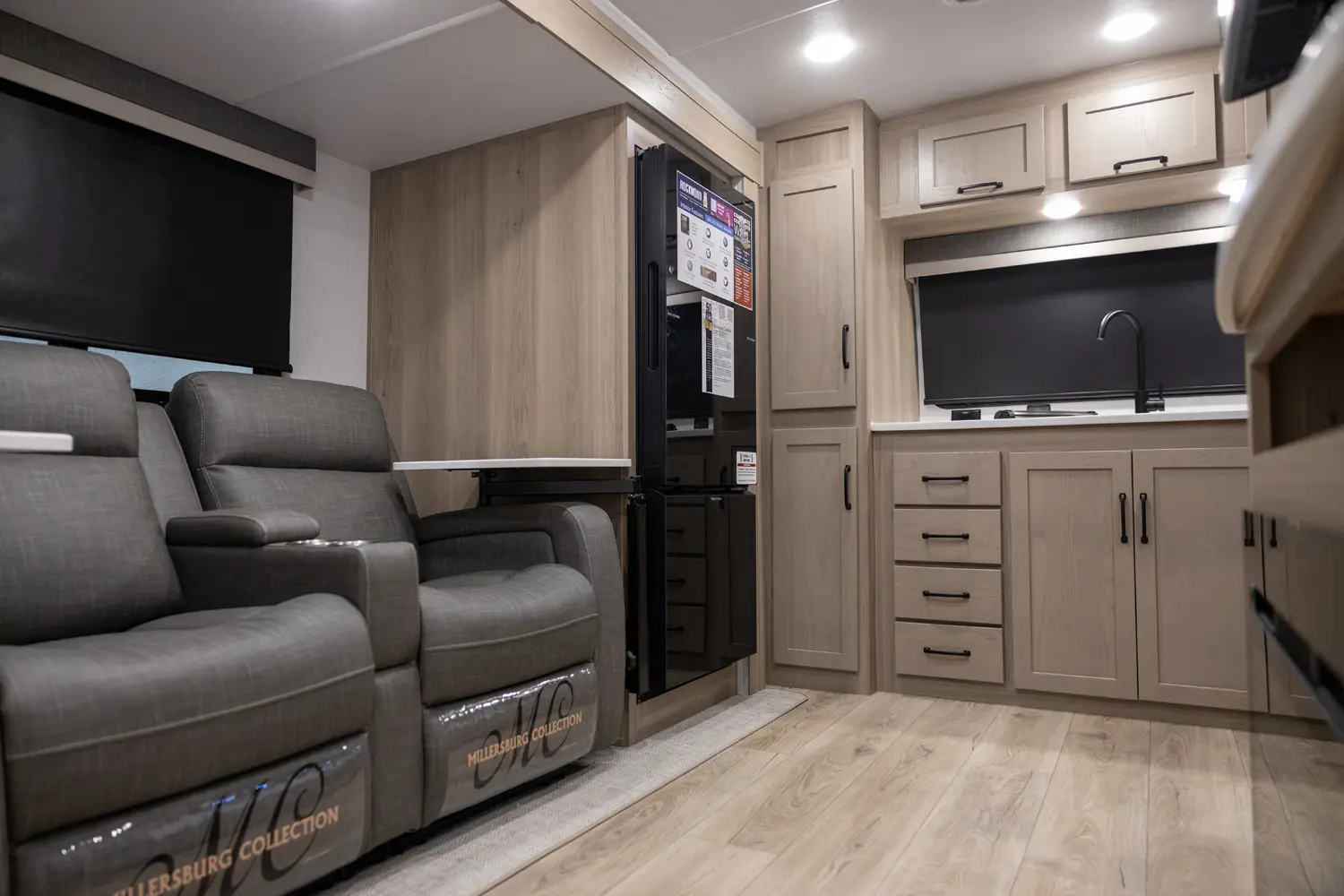 This is the first Mini Lite ever produced with a Queen bed slide. The bed slide produces so much more room in the bedroom. The double entry makes sure you're not disturbing anyone on either side of the walkthrough bathroom. The large window in the front of the camper lets you see all the beauty near the front of your campsite. The 60” theater seat can be optioned with a standing table and chairs or hide-a-bed sofa. There is nothing left to be desired in this under 26’ couples coach.