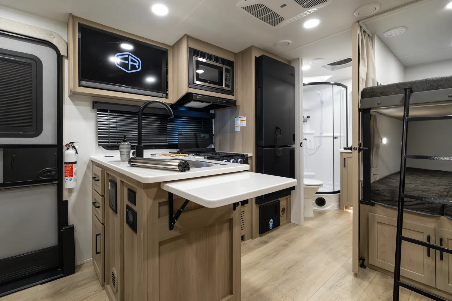 The 2520BH is a bunkhouse layout featuring a segregated front bedroom with a true queen bed and dual wardrobe closets for plenty of personal storage. In the main living area, you'll find a large U-shaped dinette, a spacious kitchen and two 36" x 71" bunks- perfect for kids or guests. This layout blends privacy, comfort, and roominess. An ideal setup for families and groups seeking versatile space on the road.