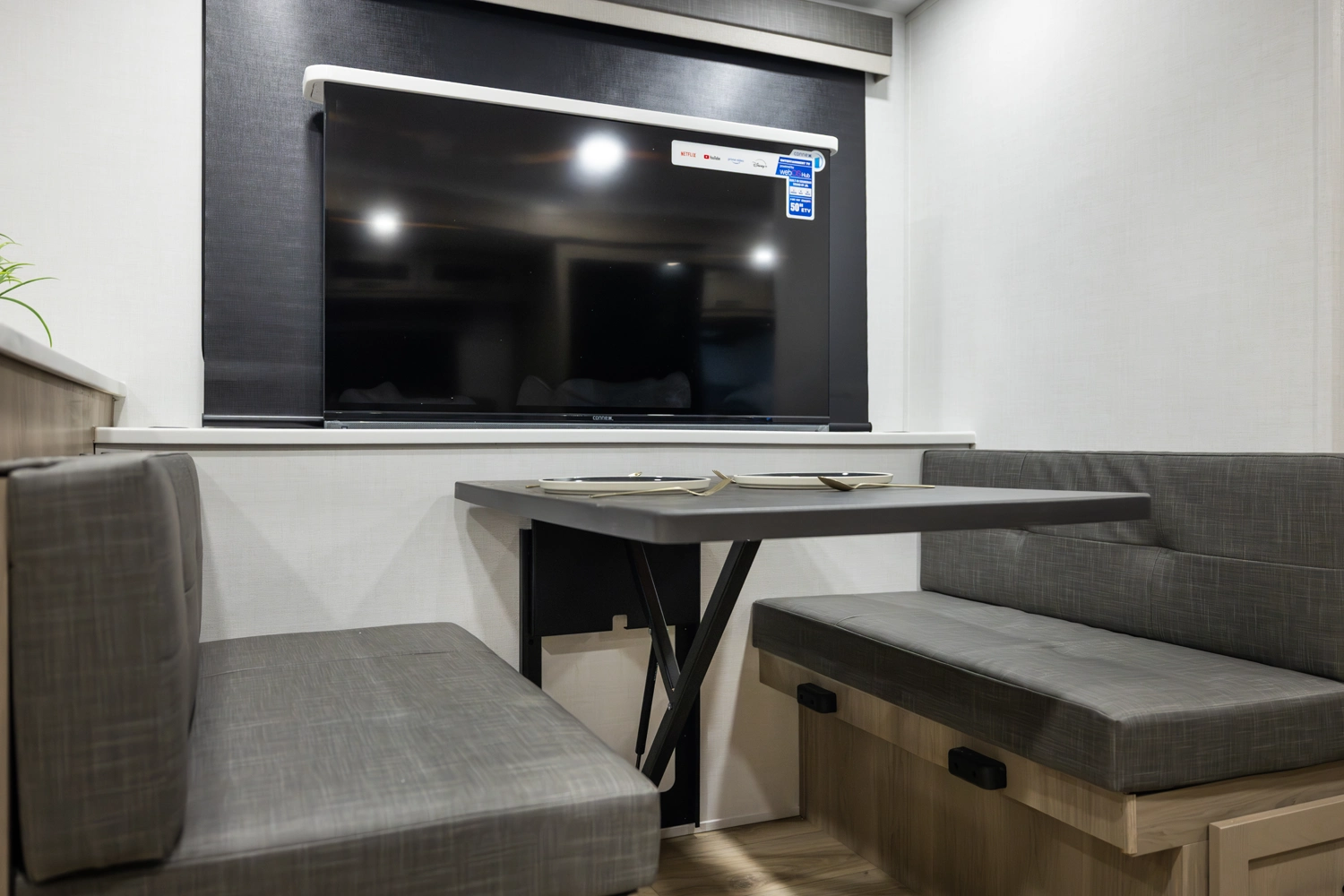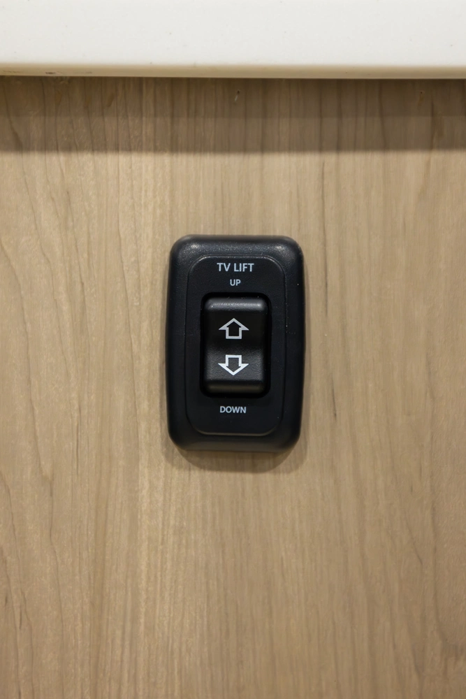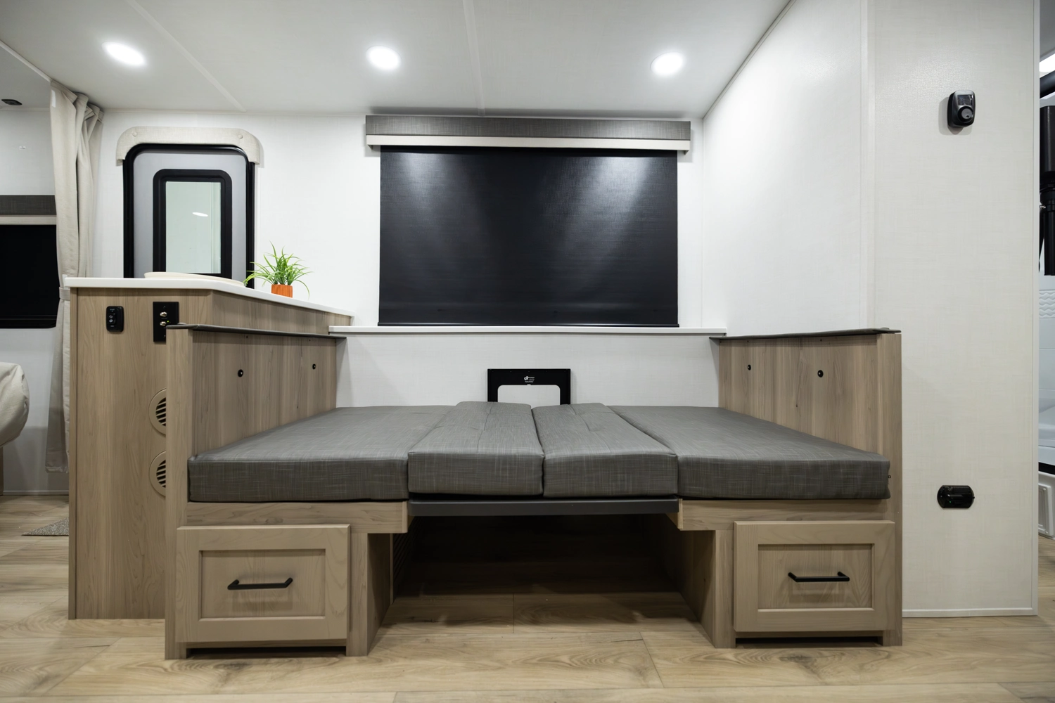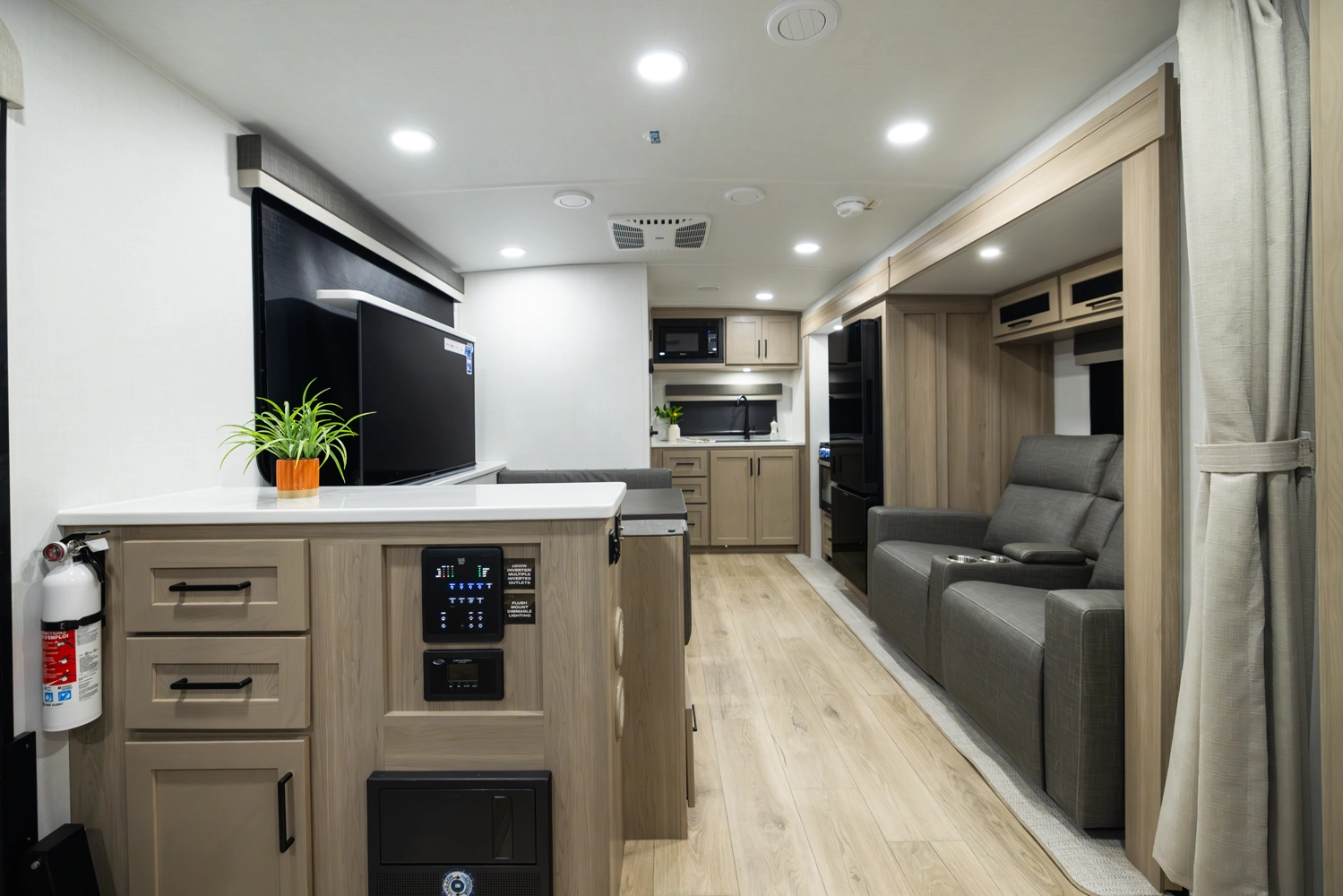 The 2522FB is a beautiful front bedroom floor plan featuring a unique wardrobe/pantry slideout for exceptional storage and organization. The living area includes theater seating directly across from the adjustable “televator” which raises for TV viewing and lowers so you can enjoy the massive door side window views. A versatile dinette and spacious rear kitchen with plenty of counter space completes the thoughtful design.
