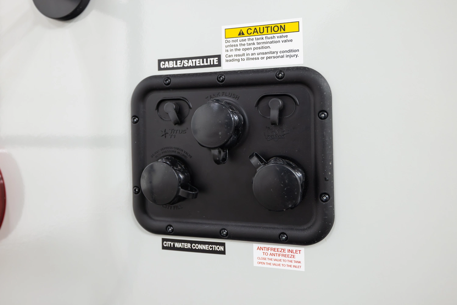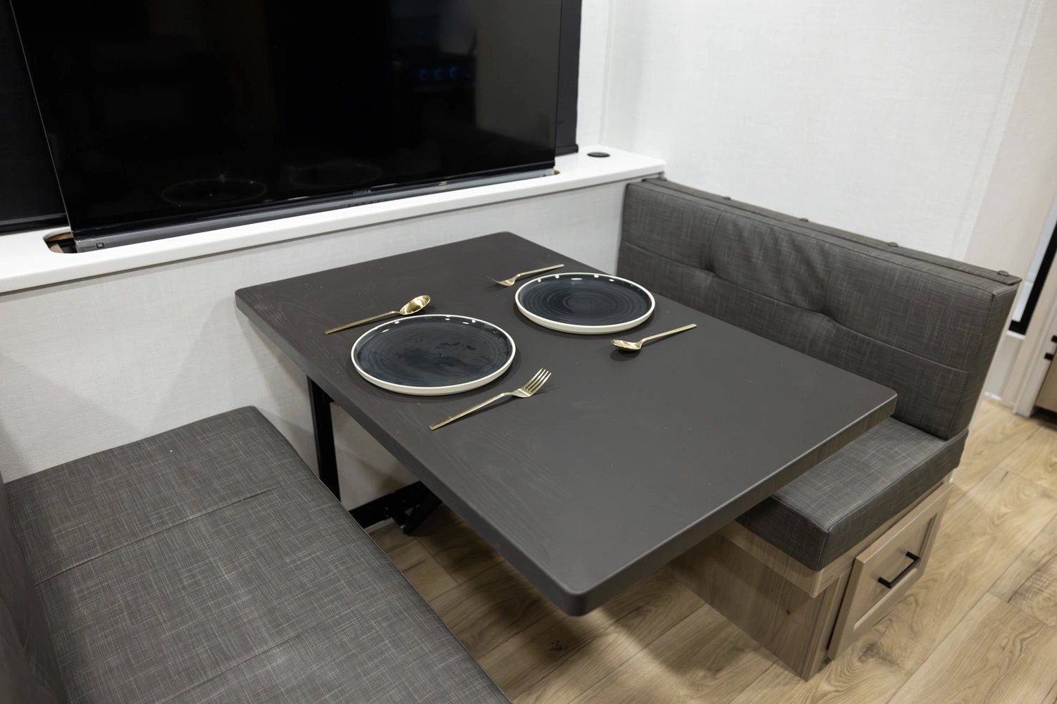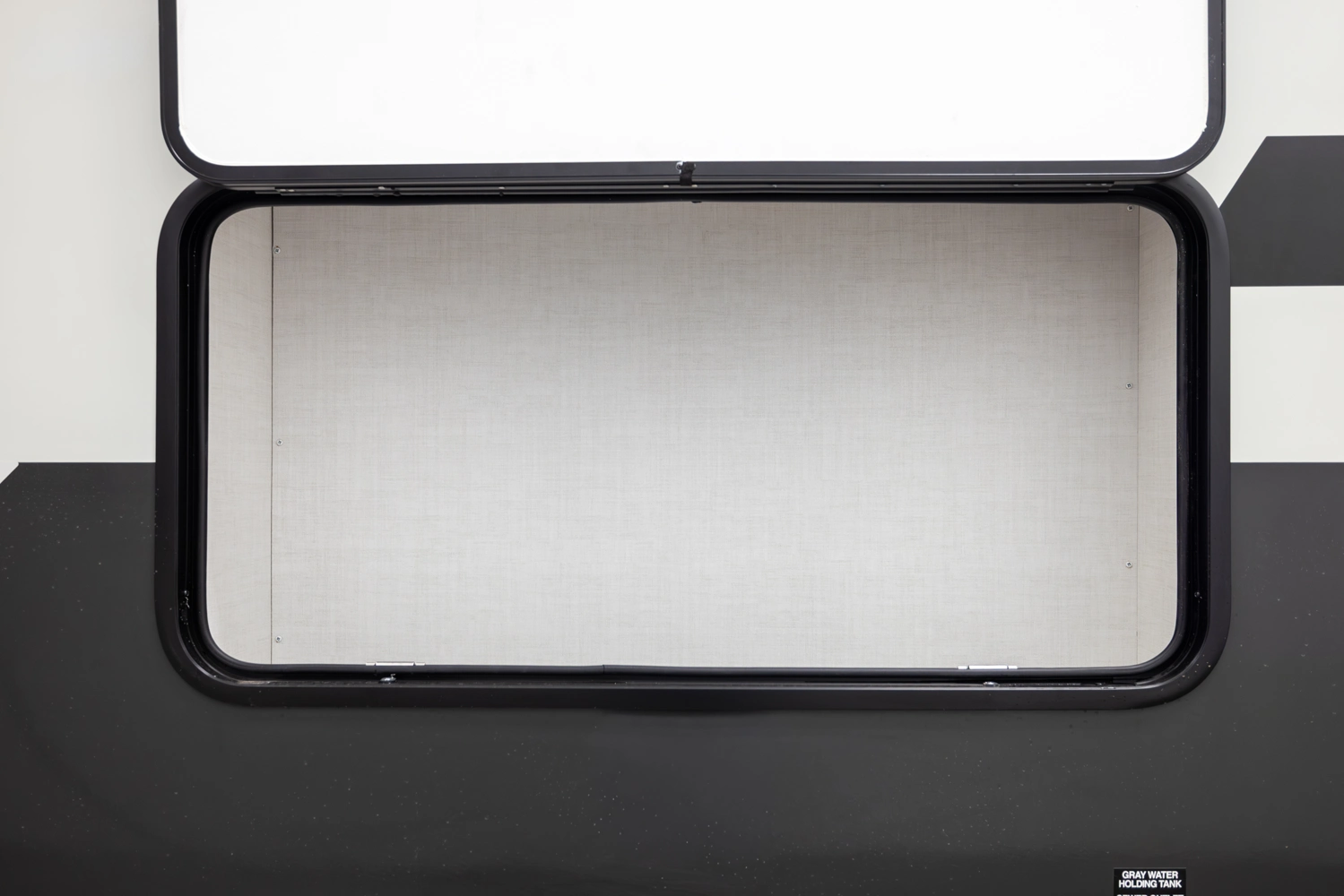 The 2522FB is a beautiful front bedroom floor plan featuring a unique wardrobe/pantry slideout for exceptional storage and organization. The living area includes theater seating directly across from the adjustable “televator” which raises for TV viewing and lowers so you can enjoy the massive door side window views. A versatile dinette and spacious rear kitchen with plenty of counter space completes the thoughtful design.