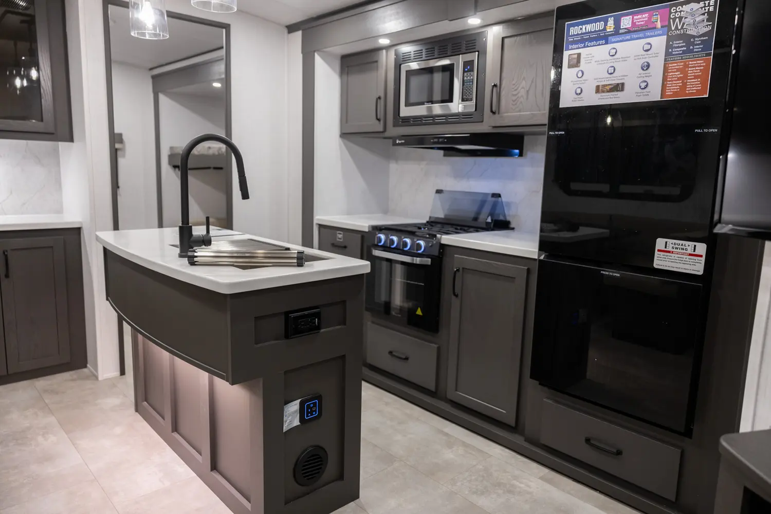 This four slide bunk model has great sleeping arrangements and a U-Dinette that can seat everyone for dinner. The outside camp kitchen has a large refrigerator and cooking stove to feed everyone you are sleeping for the trip. The bunkroom has its own entertainment and hard door for separation from the rest of the coach. The king bed option and the washer and dryer prep make this coach great on every occasion for any family.