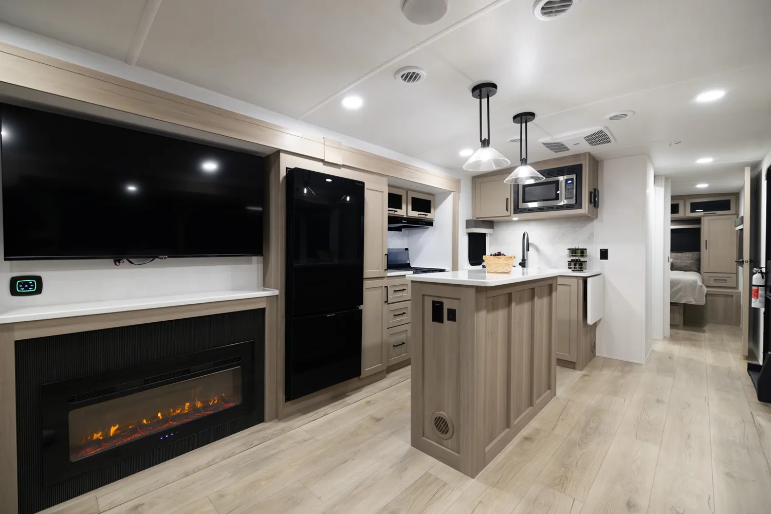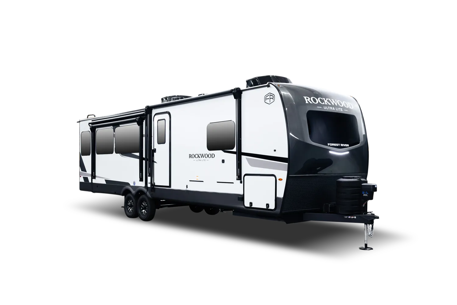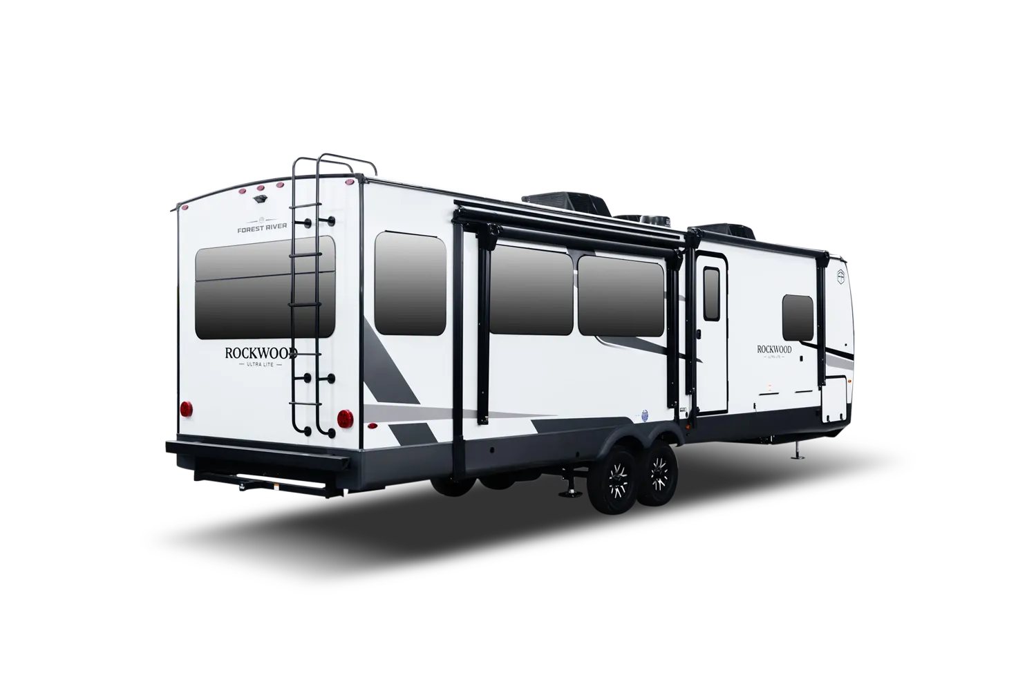 The Rockwood 2906RL Ultra Lite delivers a spacious, comfortable layout designed for easy towing without sacrificing features. Up front, it offers a private bedroom with a true queen bed. The large bathroom includes a rectangular shower and linen storage for convenience. The massive living area features a TV, fireplace, 78" hide a bed, 68" theater seating, and a 44" dinette, while the kitchen island provides extra prep space and storage, making this Ultra Lite perfect for family adventures.