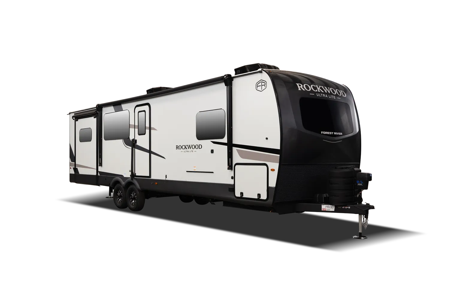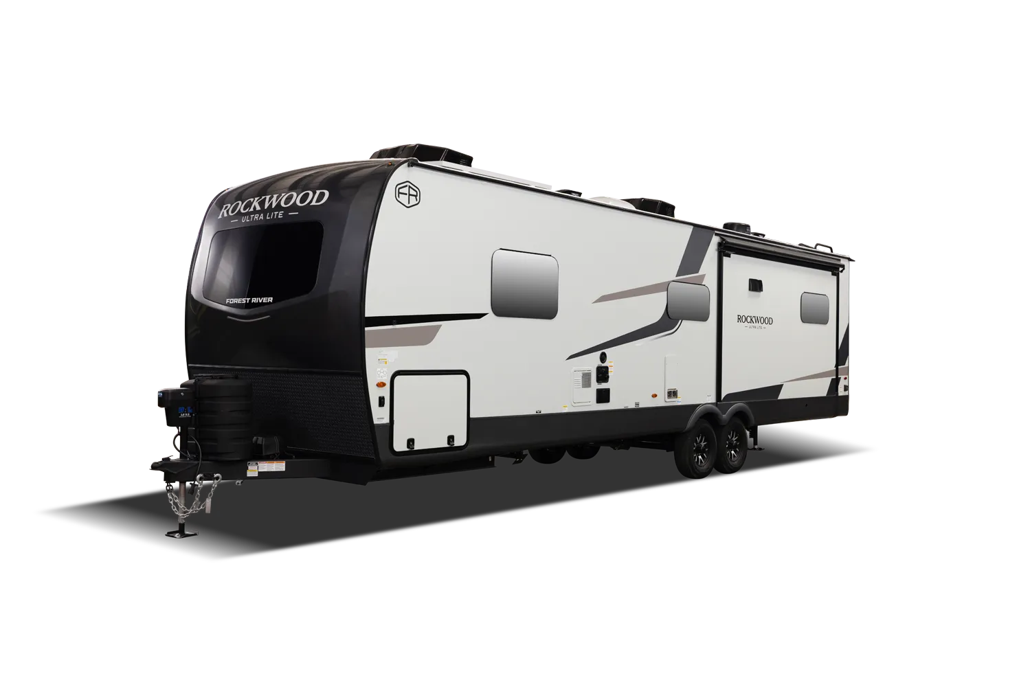 The Rockwood 2908SRL impresses with a beautiful rear entertainment center and rear living area featuring two 60" hide a beds and a 60" theater seat. In the kitchen, enjoy a table with barstools and plenty of countertop space. In the bathroom, a large rectangular shower, and in the front bedroom, a true queen bed, making this Ultra Lite perfect for comfort, style, and family fun on the road.