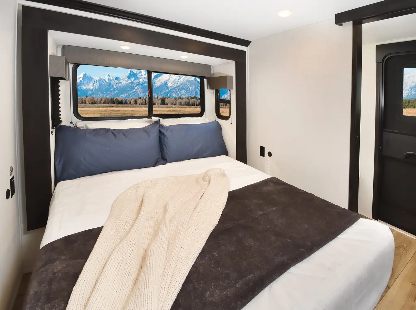 Experience the ultimate in 5th wheel RV living with the Sabre 36DBB by Forest River. This spacious two-bedroom layout offers a luxurious guest suite with a queen-size bed, ample wardrobe space, and a private bathroom with a shower. The innovative drop-frame chassis design creates a spacious loft, perfect for accommodating additional guests or extra storage. The island kitchen with its stylish butcher block wood finish and extendable seating completes the picture of comfort and style.