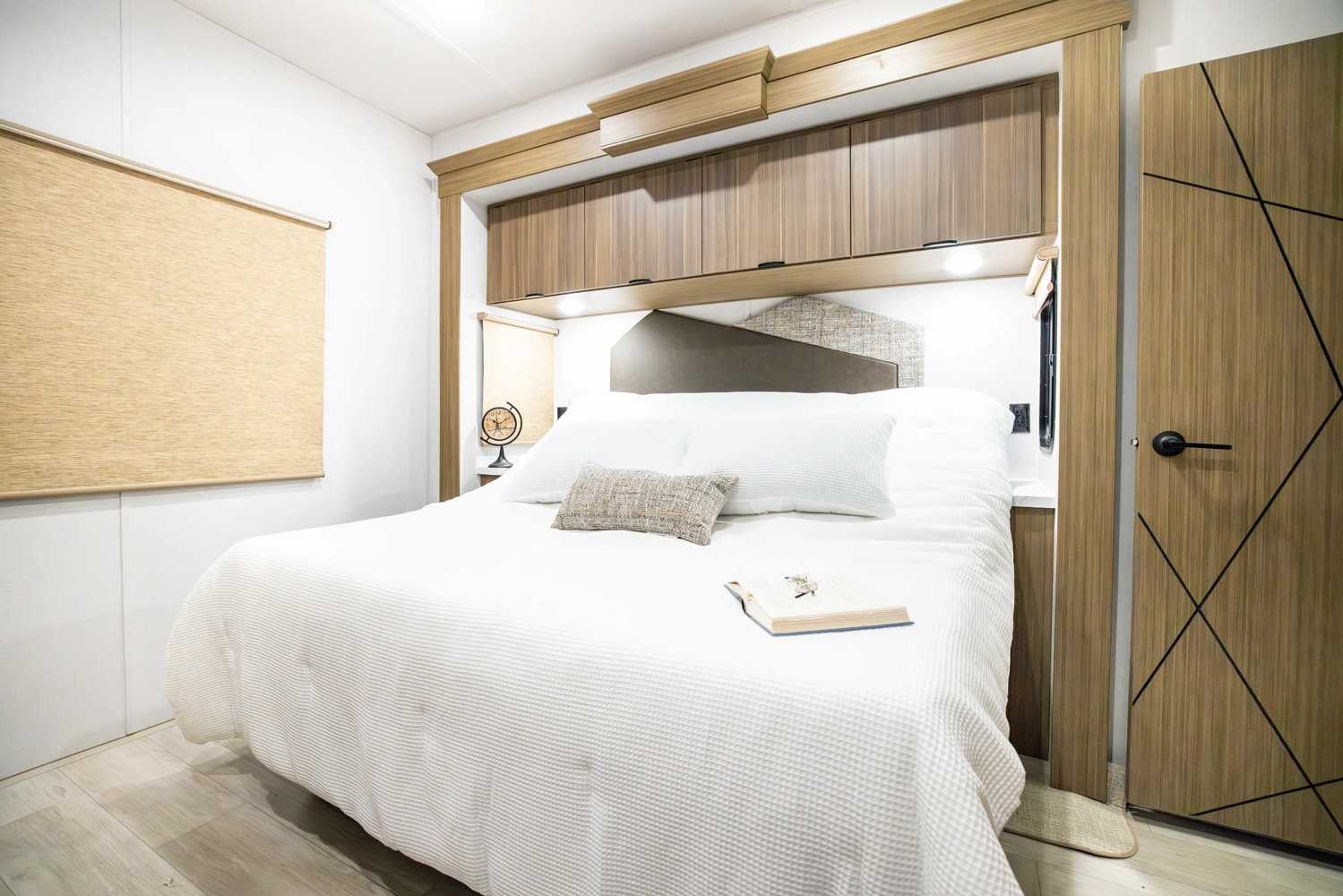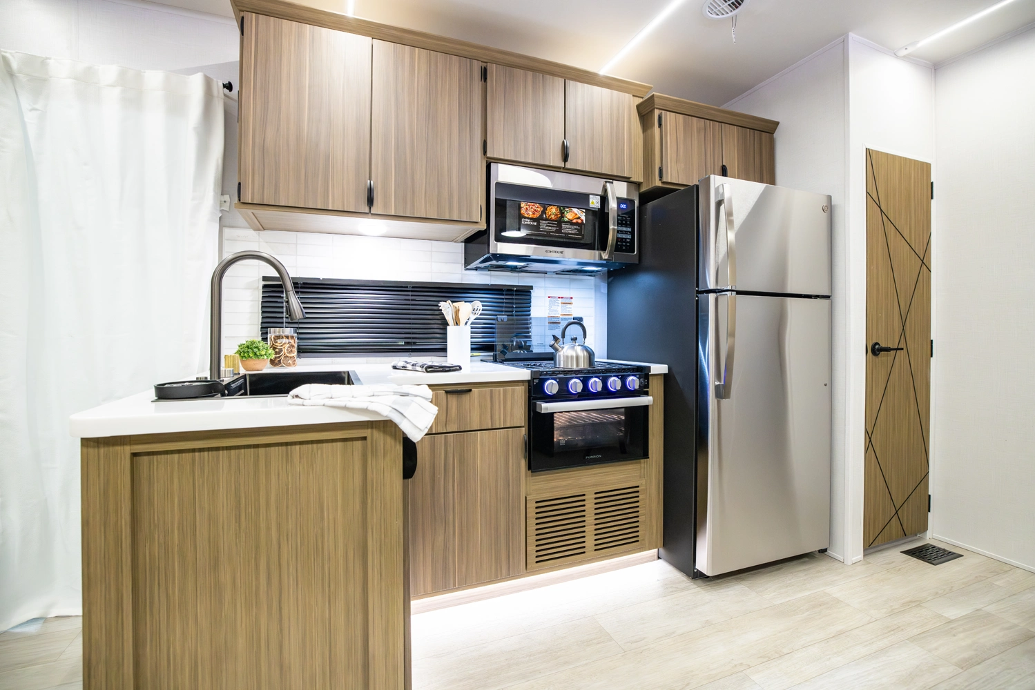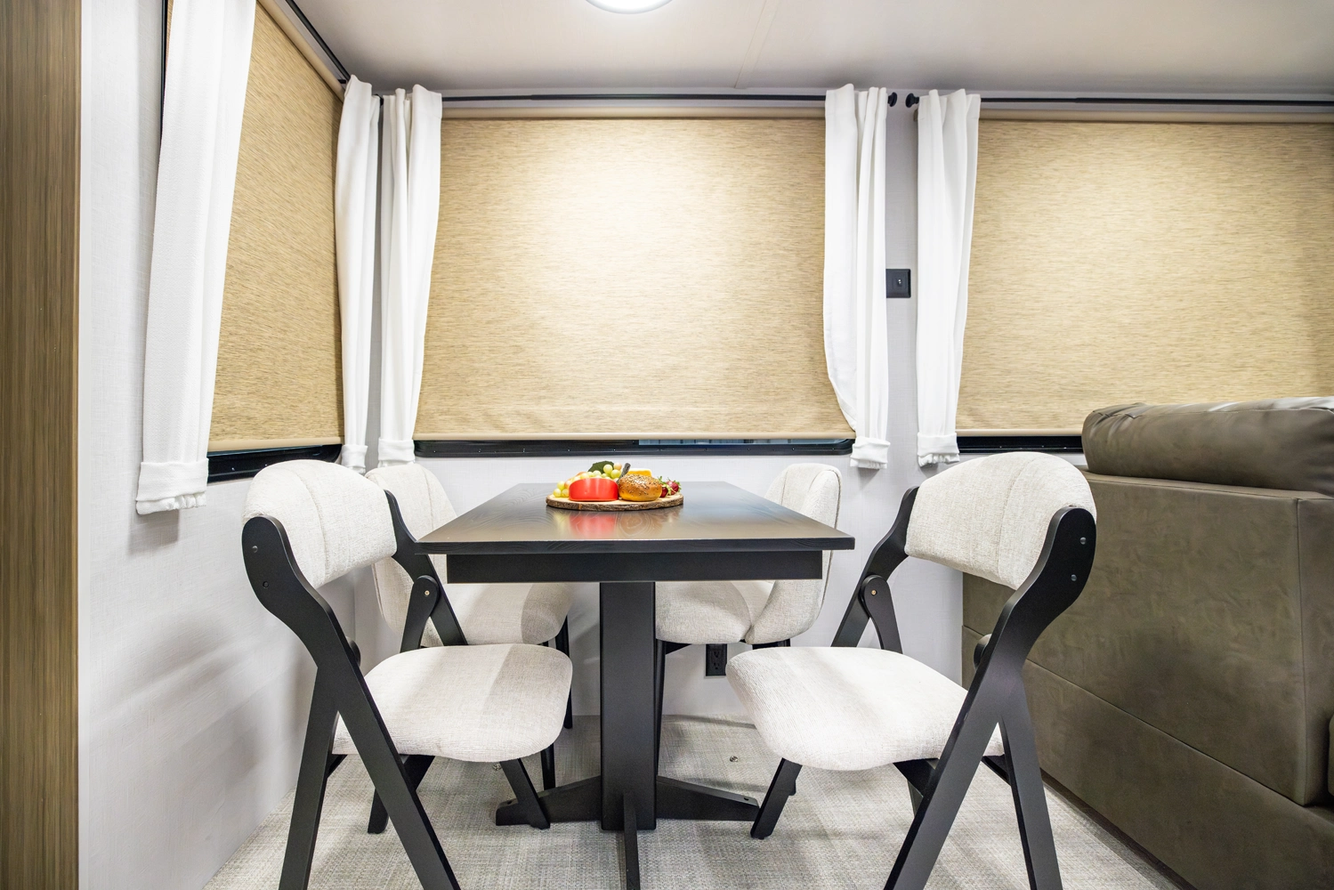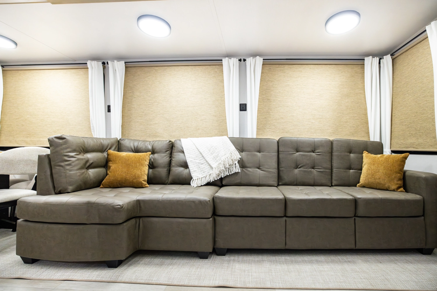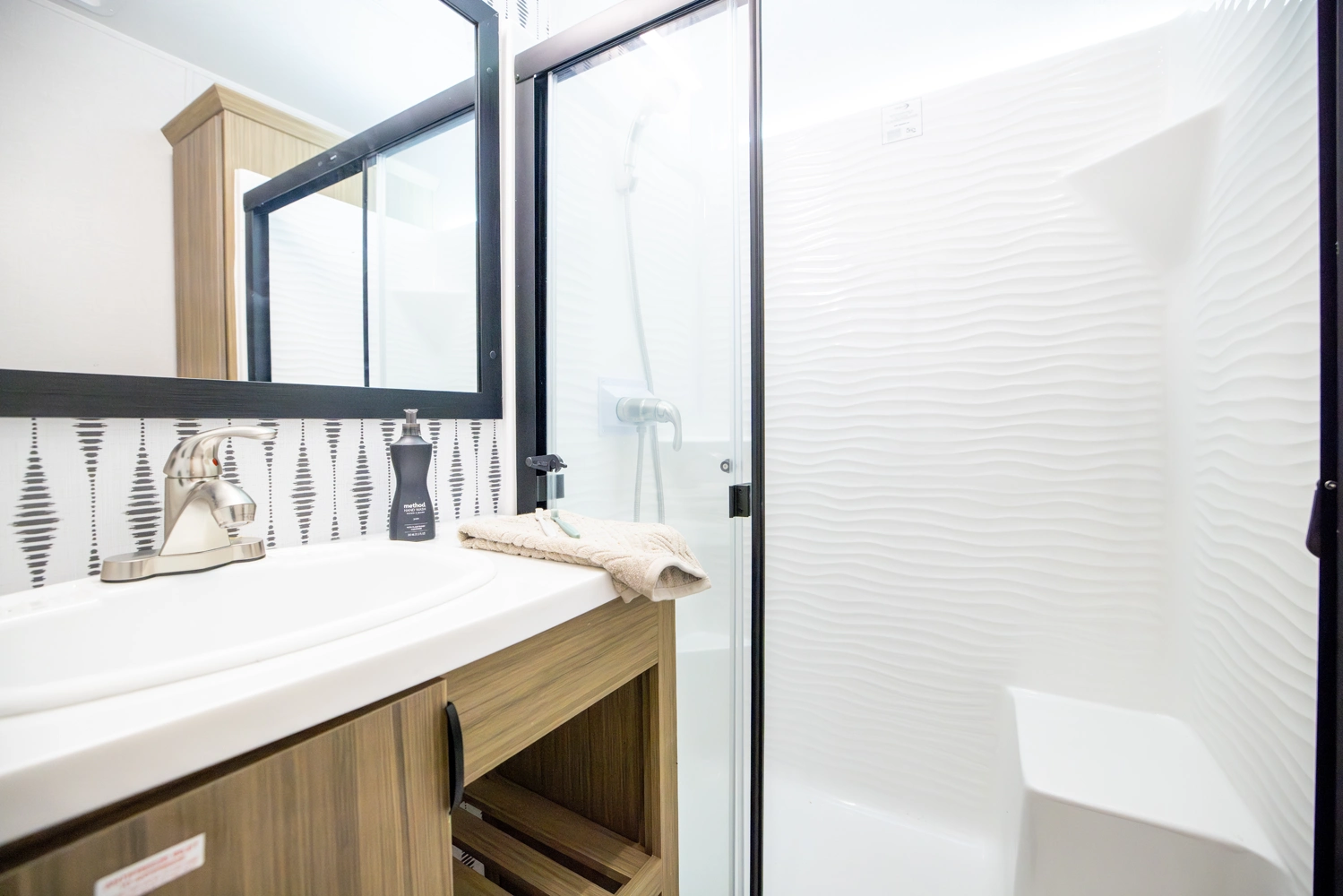 The Salem Villa 40FDEN is an open floorplan that maximizes space for a residential cottage look and feel. The panoramic windows and front slide combine great campsite views with lots of elbow room, while the kitchen and dining area are equipped with residential appliances and custom decorator touches. The large king bedroom provides plenty of storage and optional washer/dryer hookup, with the bathroom offering a walk-in shower with built-in seat, skylight, and linen cabinets.