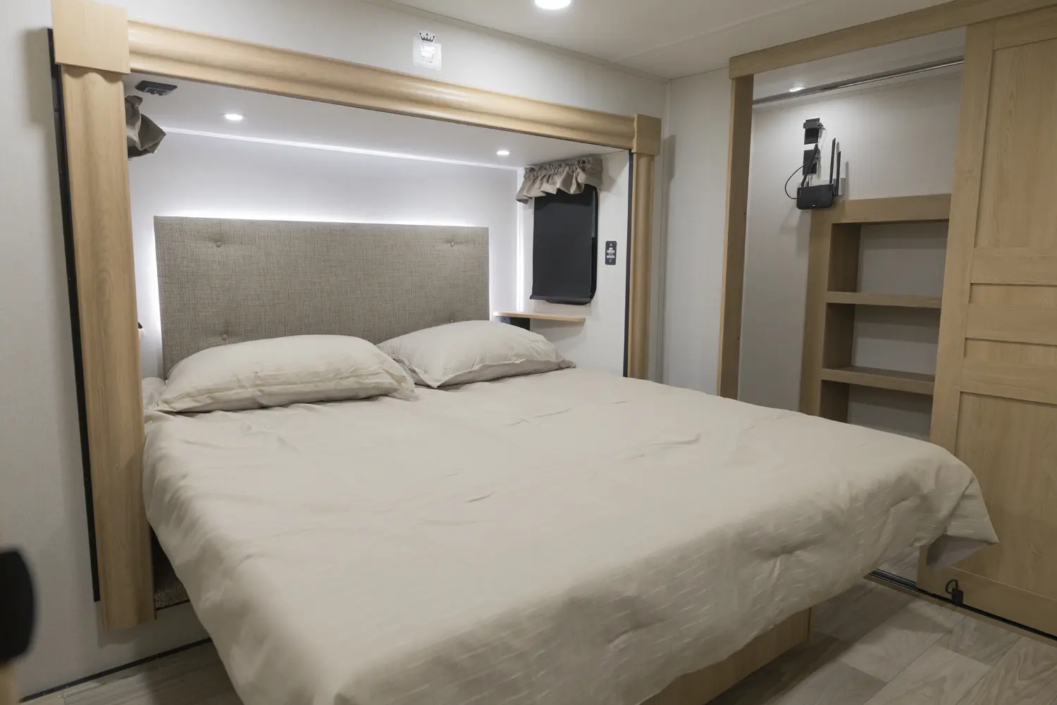 As a successor to the 3440BH, the 3550BH features the same lofted bed above the rear queen, 1.5 baths and double entry. For added comfort, the 3550BH features a king bed slide with washer and dryer prep in the front wardrobe closet. Savvy shoppers will also notice the addition of the 2nd awning. This provides full campsite coverage, and provides protection over both entry doors.
