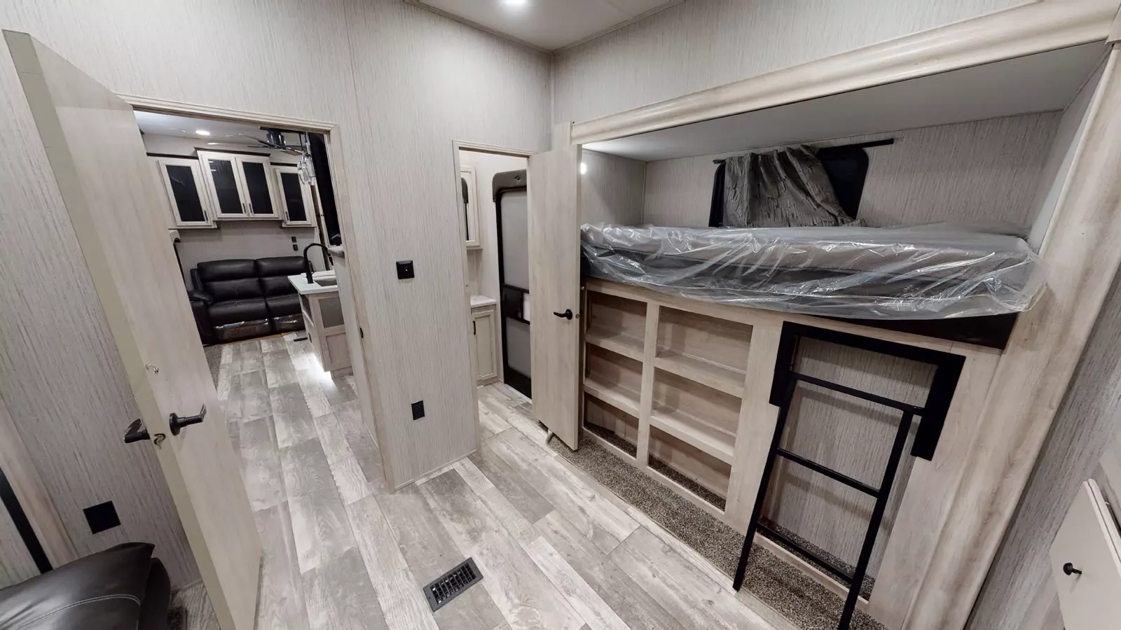 This five slide rear bunk model offers an impressive amount of living space, combined with a spacious opposing slide bunk room with floor to ceiling wardrobes. The carefully crafted entertainment center offers the perfect view, regardless if you want to lounge on the booth dinette, tri-fold hide a bed couch, or the reclining theatre seats.