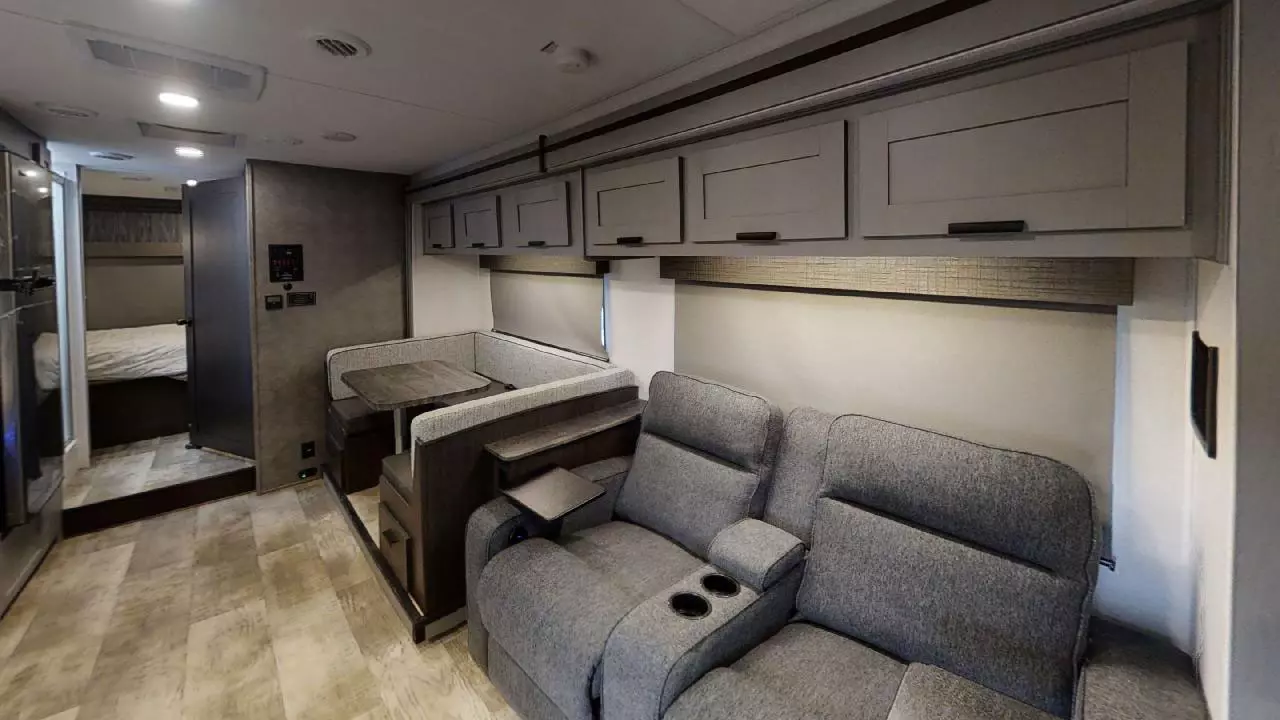 The Solera 32DSK is built on the Ford E450 chassis. This motorhome features a rear private bedroom has a 60" x 74" queen bed slide for more interior space and a linen closet with wardrobes on either side. There is also a split-style bath with a private toilet and sink, with the shower right across the hall. The kitchen area is fully equipped for meals on the go, with a 10.7 cu ft 12V refrigerator, recessed 3-burner range with flush glass cover, and a 1.3 cu ft convection microwave oven. Overhead cabinets provide additional storage. The 60" x 80" bunk over cab provides more room for sleeping plus a 12V LED TV for extra entertainment!