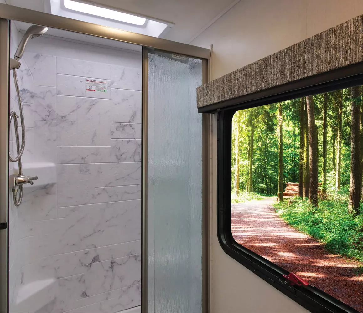 Sunseeker (Ford Chassis): An American classic for the open road. These options feature an upgraded EZRYDE suspension system for an exceptionally smooth ride, plus standard highlights like full-body paint options, slide toppers, and leather driver/passenger seats.