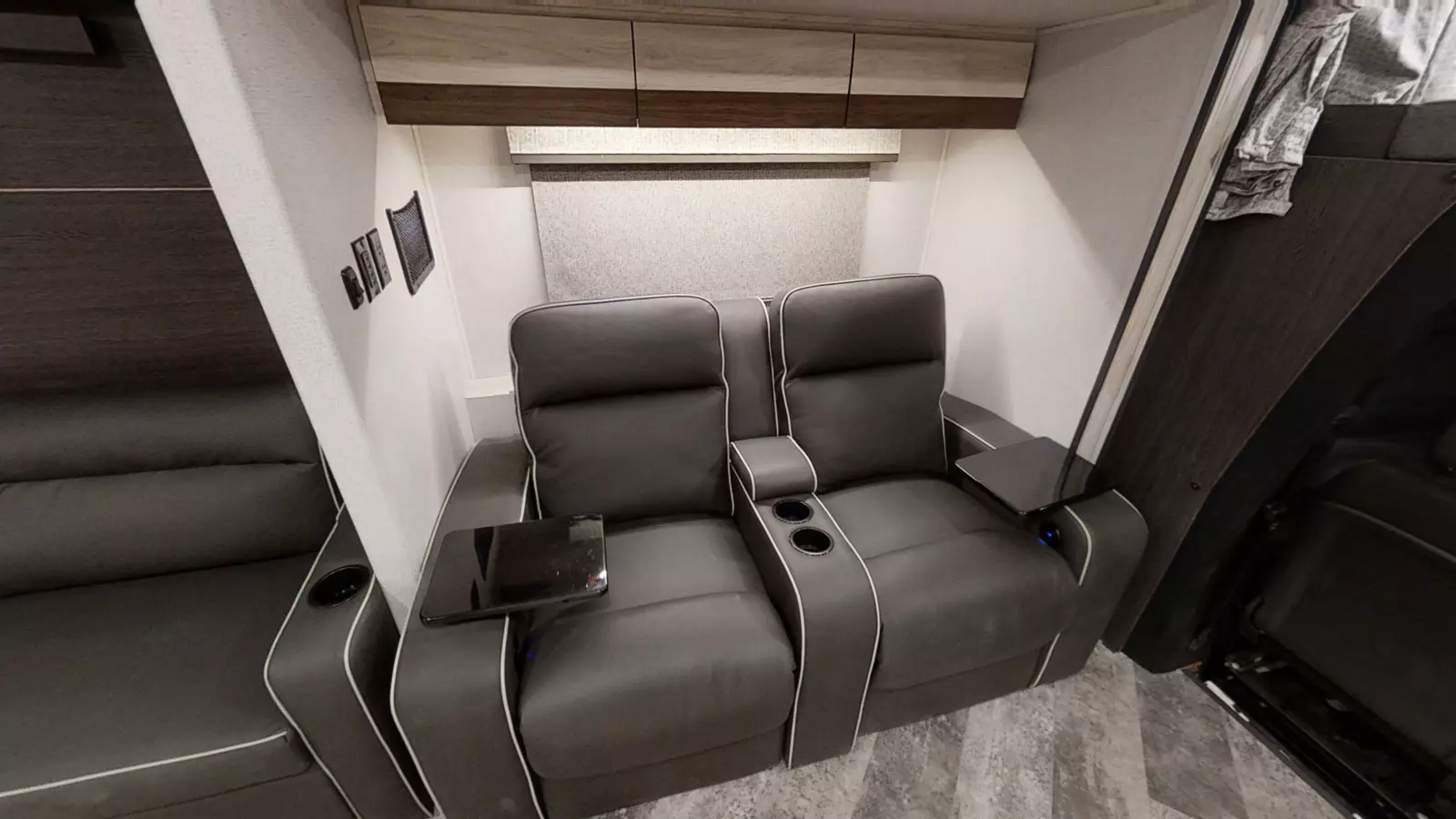 The 2400T is the perfect couple's coach, with a full rear bathroom, galley kitchen, and queen Murphy bed/sofa combo. There's a 54" x 80" cab over bunk for additional sleeping and storage space—or you can choose to add the optional Trekker cap with a built in entertainment center. This unit features a hidden storage area behind the 12V TV. And you never know when someone might sleep on the power theater seats. The 2400T is built on the Mercedes Benz Diesel 3500 chassis.