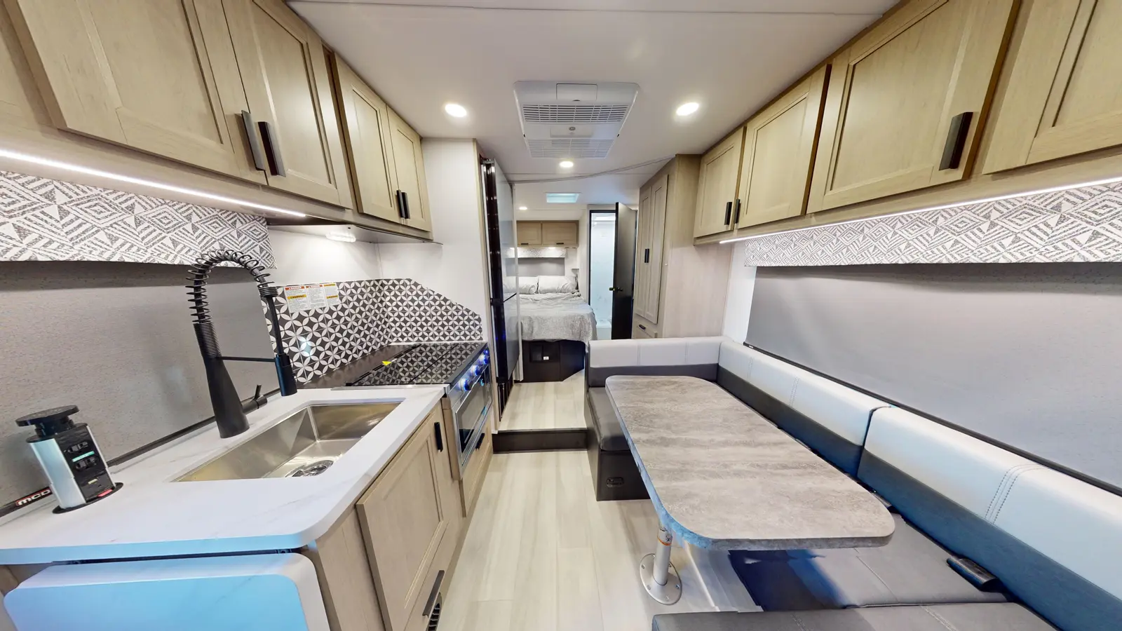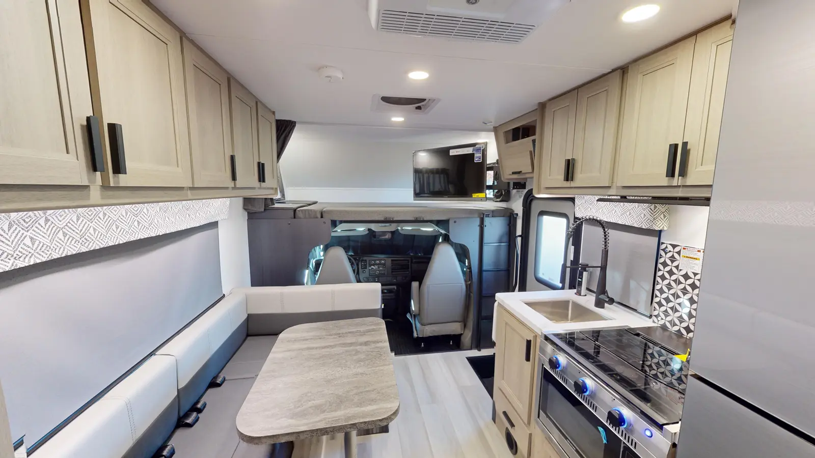 The 2350LE is built on a Chevy 3500 or Ford E350 chassis. The rear of the unit contains the bedroom and bath, with a 60" x 80" queen bed and a 24" x 32" shower with molded surround. Skylights add to the natural light and allow for fresh air as well. The large U-shaped dinette is perfect for meals or family game night, while also providing a second sleeping surface. The kitchen features a 12V refrigerator, booth dinette, cooktop, convection microwave, and sink with a flip-up counter extension.