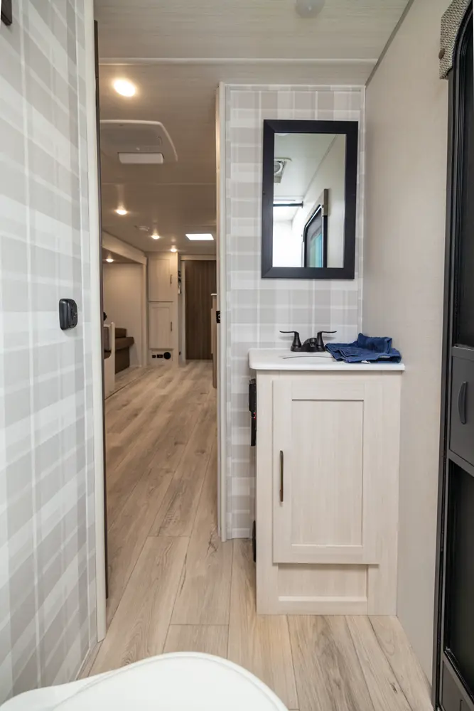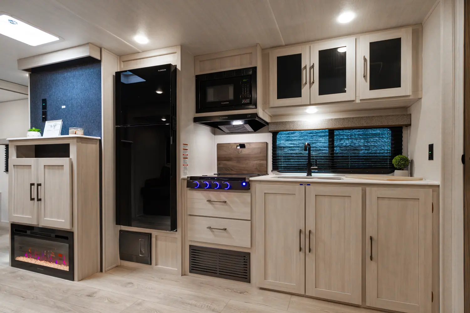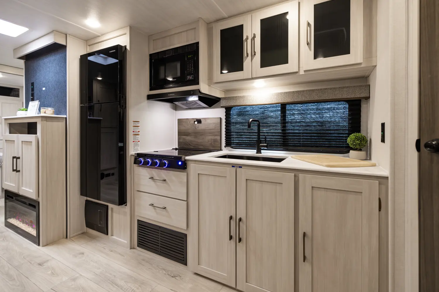 This 33' 4" travel trailer features a front queen bed, a convertible U-shaped dinette, and a rear corner bunkhouse with a ladder-accessible top bunk. The kitchen includes a 10 cu. ft. 12V refrigerator, oven, and stovetop. Exterior amenities include a 19' electric awning, outdoor camp kitchen, and a hot & cold spray port.