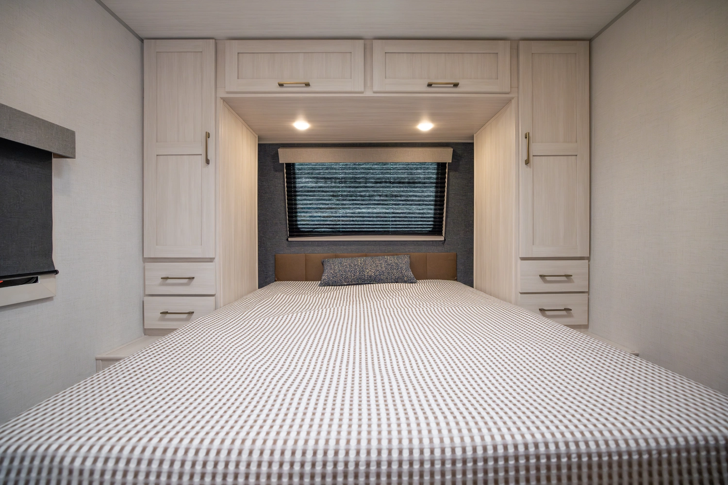This 30' travel trailer features a rear kitchen with a 10 cu. ft. 12V refrigerator and stovetop. The front private bedroom includes a queen bed with dual wardrobes and overhead storage. Living space includes a tri-fold sofa and a breakfast bar. Exterior amenities include a 21' power awning with LED lights and pass-through storage.