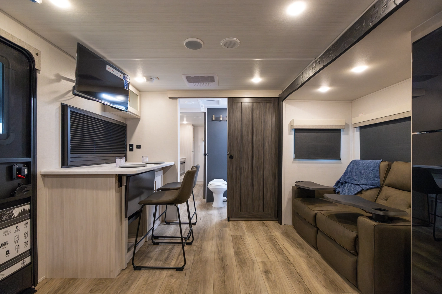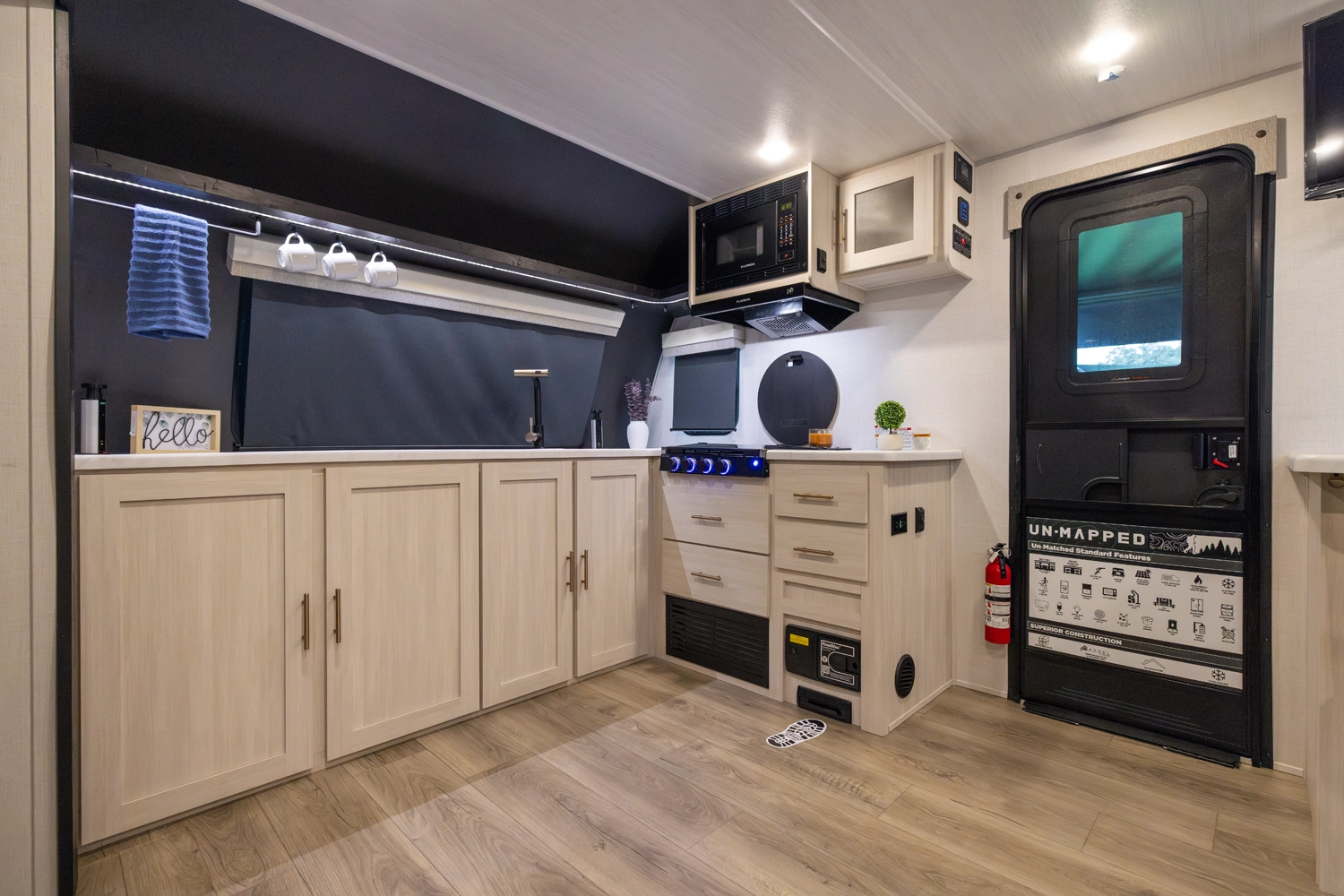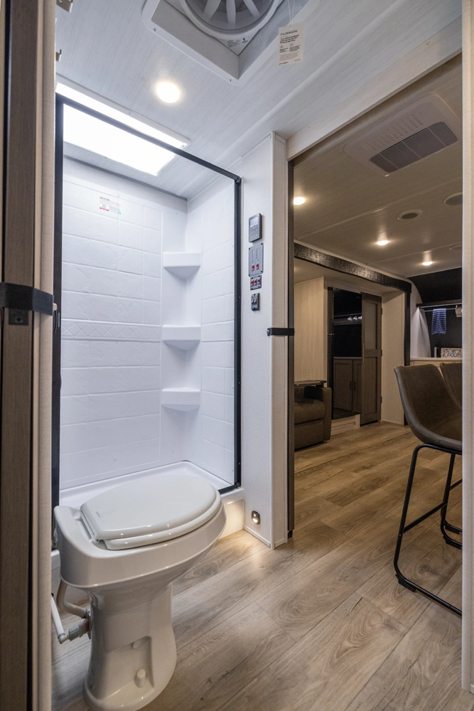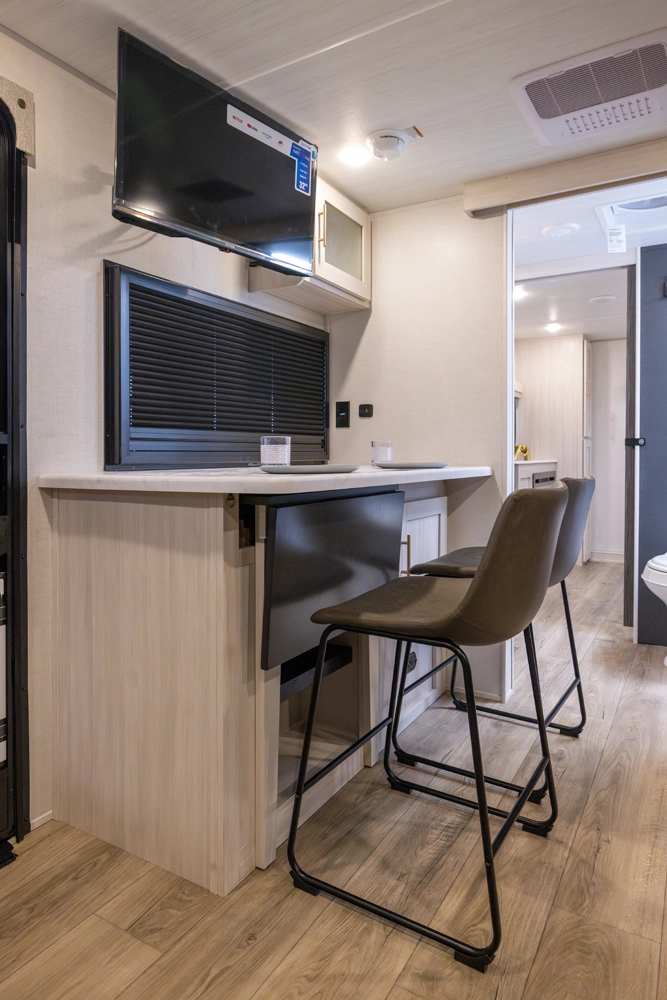 The Un•Mapped 25FK features a front kitchen with a 12V black glass refrigerator and an air fryer microwave. The Bar2Table pull-out dinette and TrailGate outdoor bar enhance dining flexibility and outdoor entertaining. Inside, enjoy a king bed, 15K A/C, and a tankless on-demand water heater. Exterior amenities include a 21' powered awning and a hot & cold spray port.