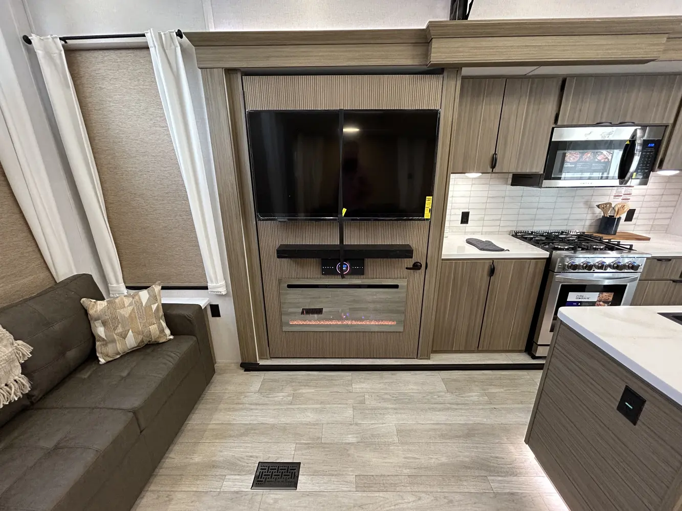The Wildwood Grand Lodge 42DL is another fantastic double loft destination trailer. In addition to the HUGE double loft bonus room for the kids, there is a front queen bedroom for the adults, plus additional sleep options in the living room. The bathroom includes a walk-in shower with a built-in seat, while the island kitchen provides residential appliances and plenty of room for all the cooking essentials.