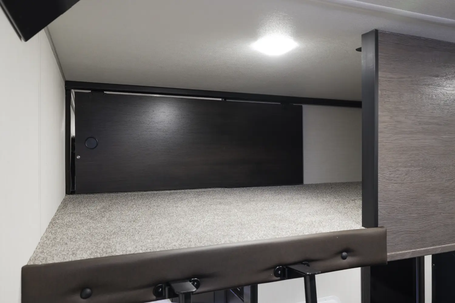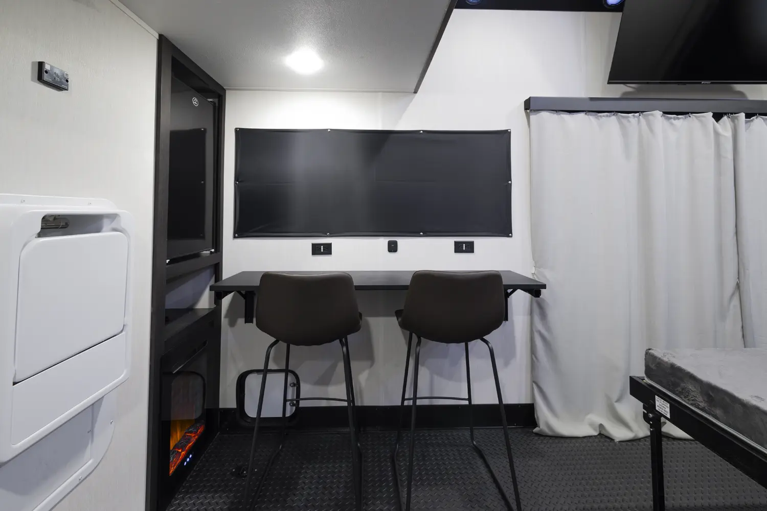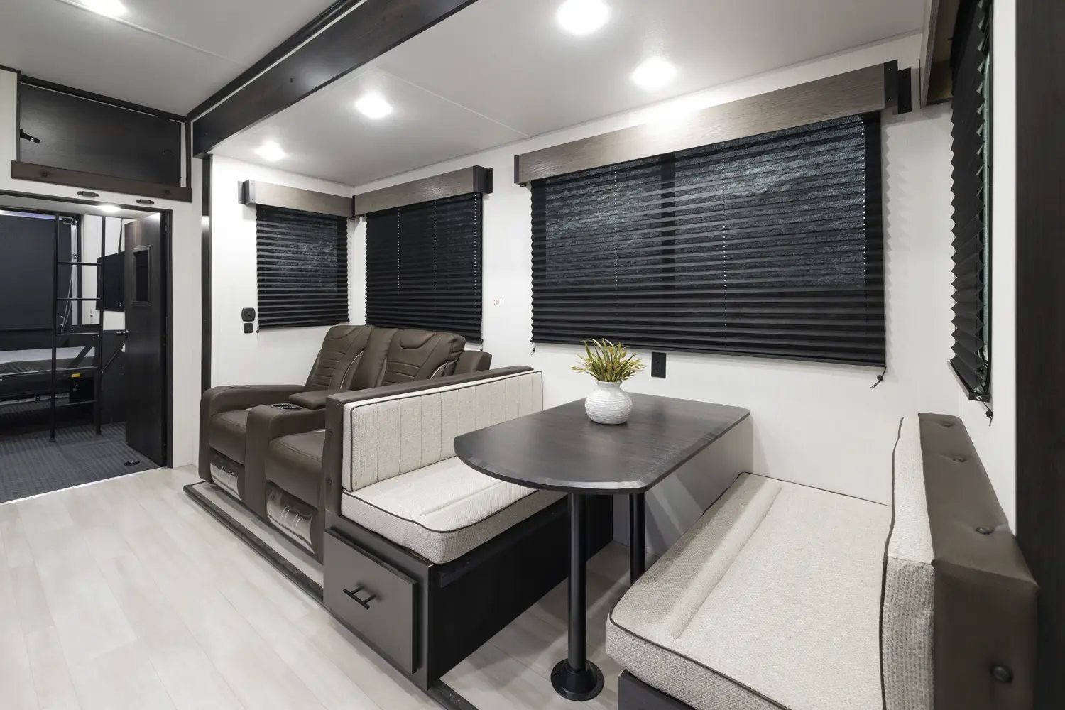 The Wolf Pack 350PACK15 Toy Hauler 5th Wheel by Forest River combines versatility and comfort. Its 15-foot garage doubles as an extra bedroom and features a sliding glass door for a bright, open feel. The kitchen and living area offer hidden pantry storage behind the entertainment center, cozy theater seating, and a dinette that converts into a bed. The primary bedroom boasts a king-size bed with no slide-out for reduced hitch weight, making this model perfect for adventurous families.