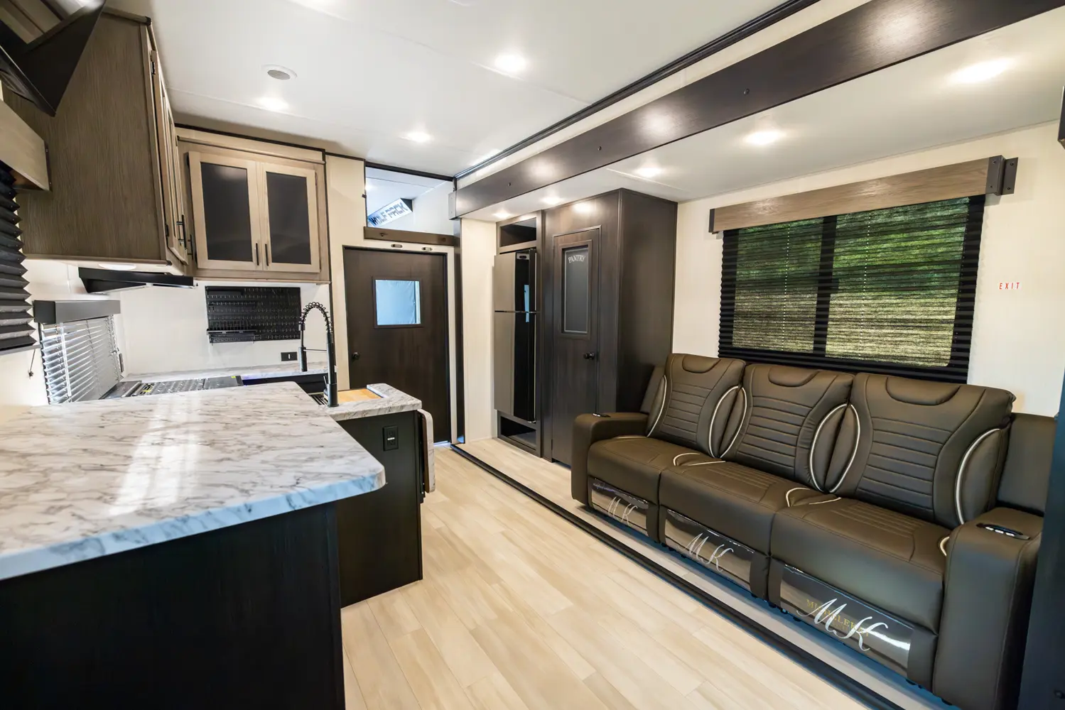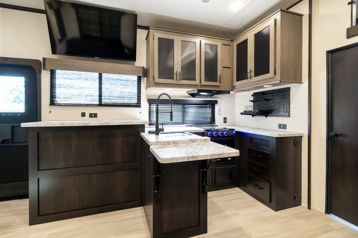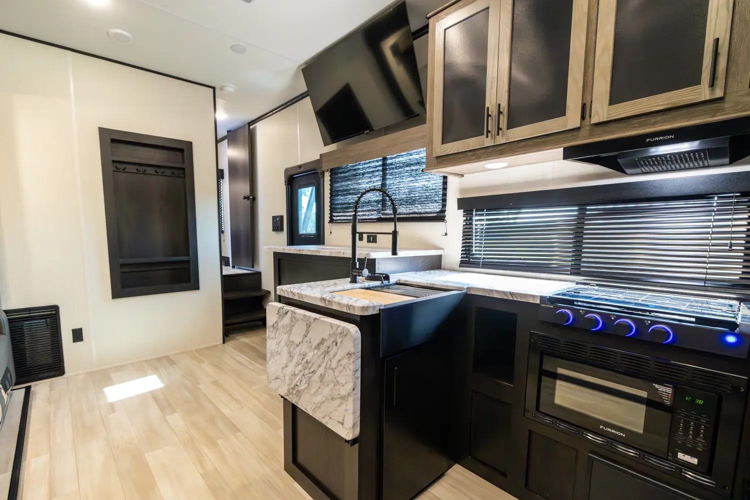Experience the ultimate in versatility and luxury with the Wolf Pack 360PACK15.5 Toy Hauler 5th Wheel by Forest River. This model boasts an expansive 15.5-foot garage, perfect for hauling your favorite toys, and features Wolf Pack's signature sliding glass door with oversized windows for natural light and outdoor views. The thoughtfully designed living area includes bar-top seating, a spacious kitchen with a flip-up counter extension for added prep space, and a generously sized pantry.