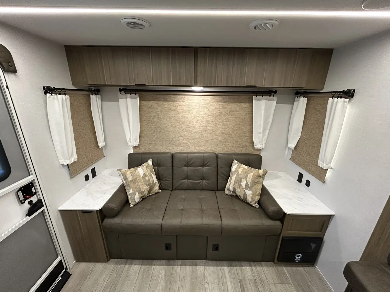 The 24RLXL is an extra-light travel trailer that comes in at 28' 11" and just over 5,000 lbs. The master bedroom features a ton of storage, including dedicated C-pap cubbies! The bathroom provides loads of storage as well, plus a walk-in shower. The kitchen is well-appointed with modern appliances and an oversized 11 CU. FT. refrigerator, fireplace, and U-dinette.
